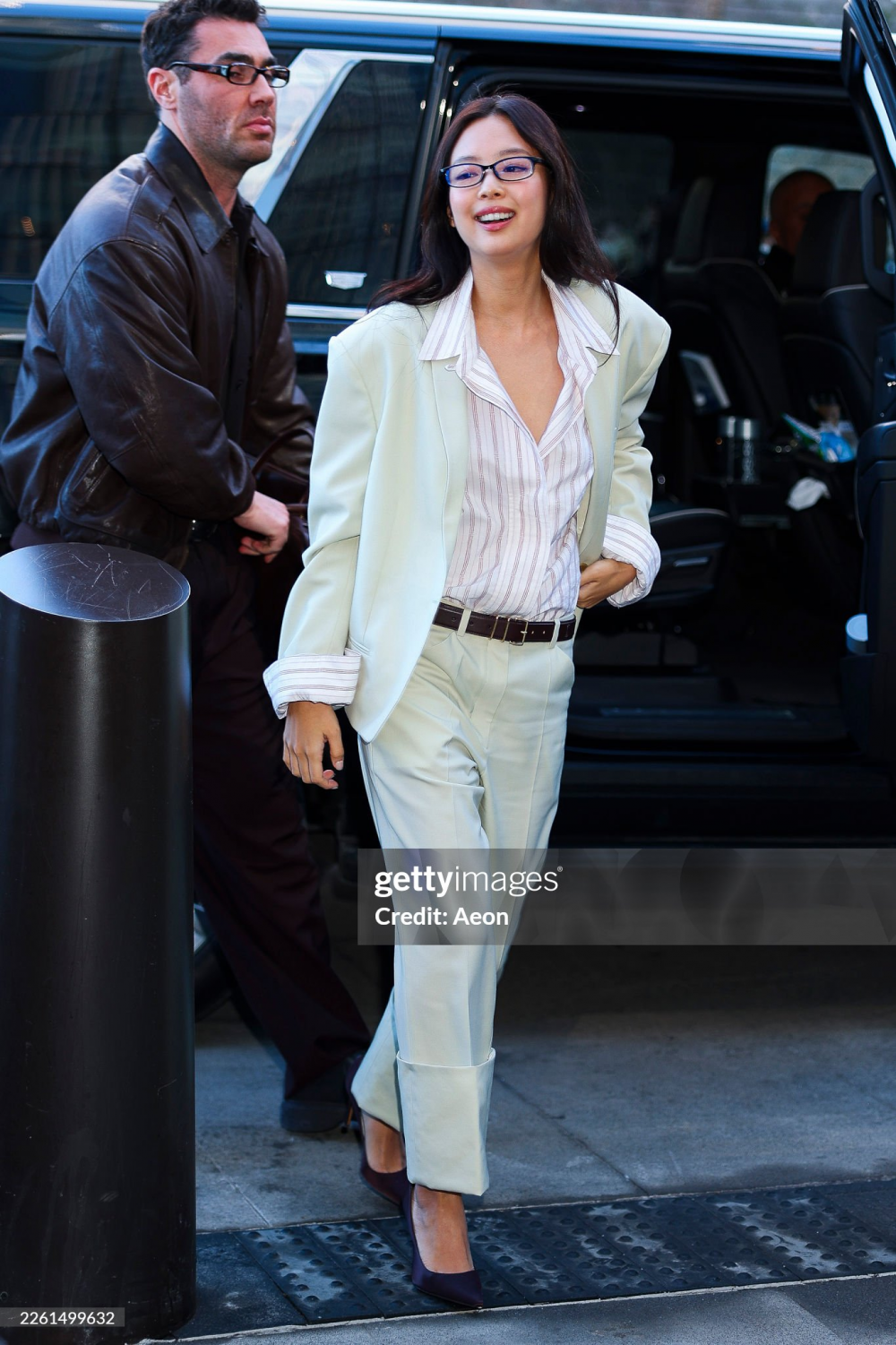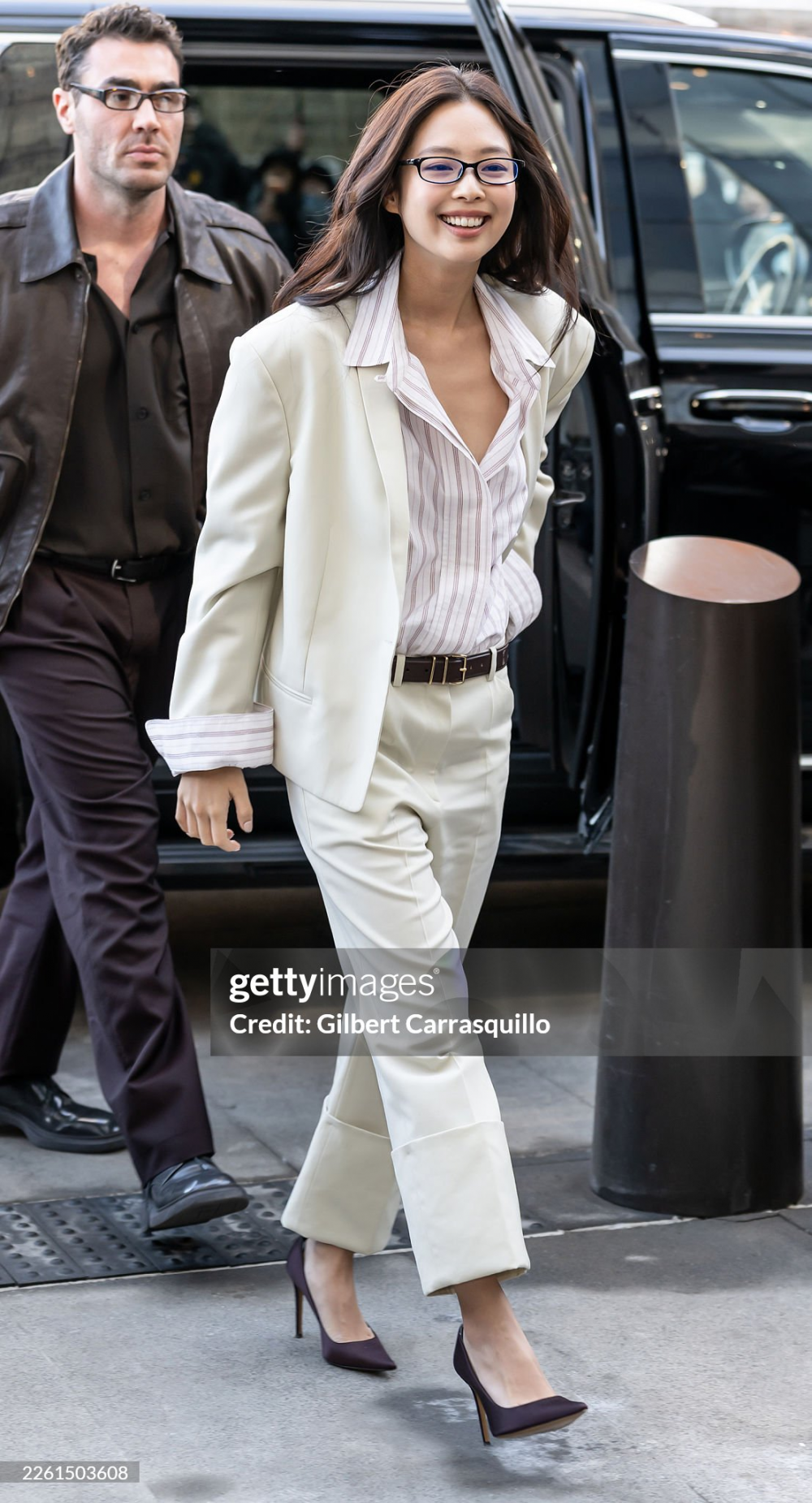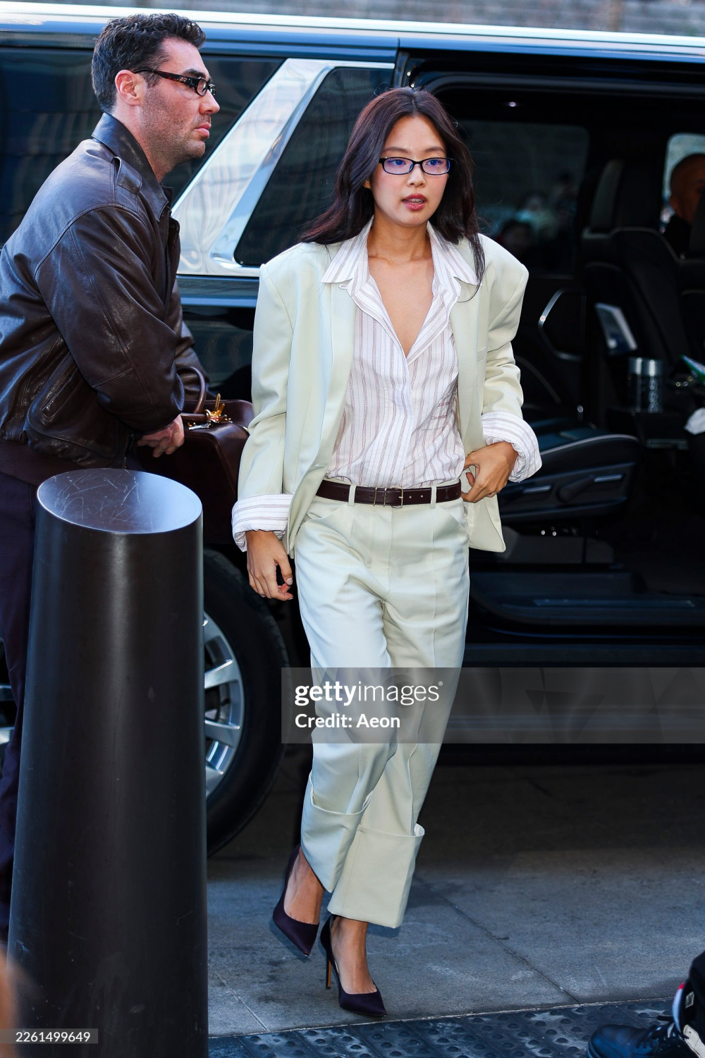 2月14日,Jennie現身紐約Calvin Klein時裝展。她以一身優雅的象牙色西裝搭配條紋襯衫及眼鏡亮相,登場時已令人留下深刻印象。其自然風格的髮型與妝容,更突顯了這套特別訂製服裝的細節。