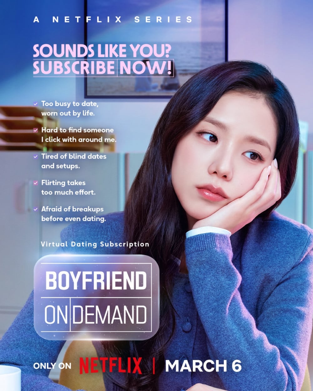 《Boyfriend On Demand》定於3月6日首播,是一部浪漫喜劇,講述被現實壓垮的網漫製作人美來,透過一款戀愛模擬裝置訂閱並體驗虛擬戀情的故事。該劇將引起共鳴的職場生活與虛擬世界中「訂閱式戀愛」的新鮮概念結合,旨在帶來共鳴與輕鬆樂趣。Jisoo與徐仁國共同主演,由曾執導《酒鬼都市女人們》、《無用的謊言》等熱門作品的導演金正植掌鏡。