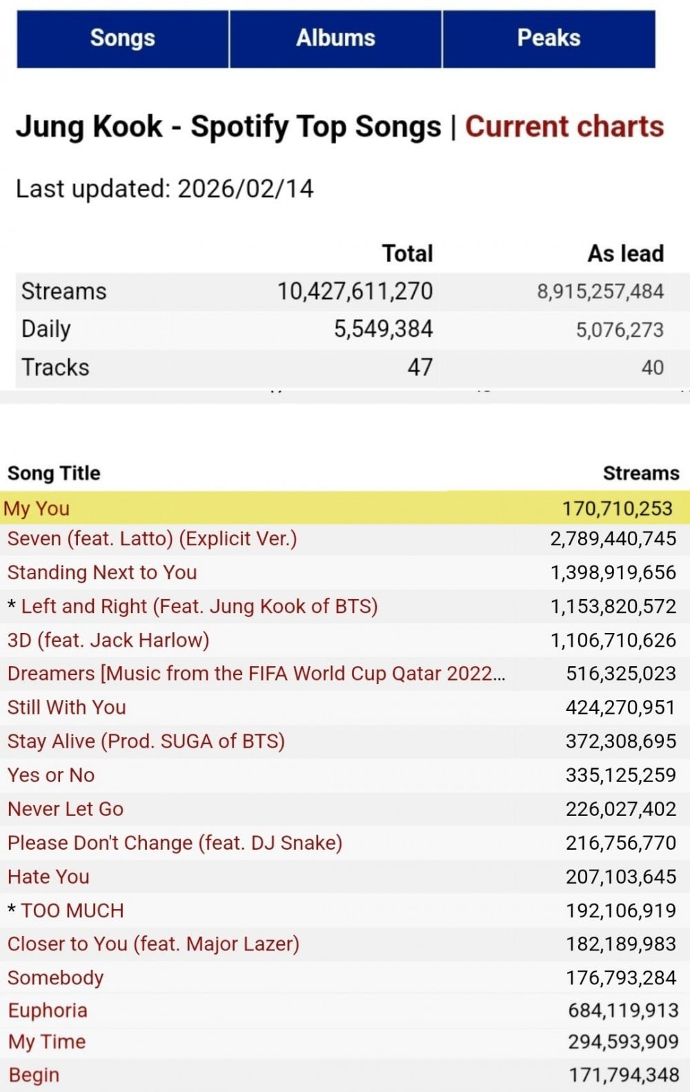 這是Jungkook第18首在Spotify突破1.7億串流量的個人作品。《My You》最初為慶祝BTS出道九週年而免費發行,其後雖正式發行為數位單曲,仍持續在全球平台獲得穩定串流量,展現長尾人氣。