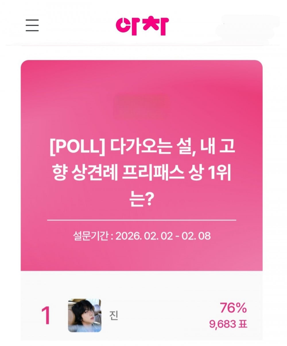 Jin 在 Idol Chart 名為「農曆新年將至,誰是帶回鄉見家長通行證第一名?」的調查中榮登榜首。該投票於2月2日至2月8日進行,Jin 獲得9,683票,佔總票數的76%。在踴躍參與下,他以壓倒性優勢領先並穩守冠軍位置。