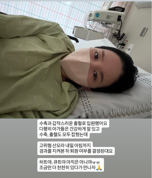 2月15日,ChoA在其社交媒體上分享:「我因宮縮和突然出血而住院。」她補充道:「幸好寶寶們都很健康,宮縮和出血情況也已受控。不過,由於我被列為高風險妊娠,醫院將觀察我的情況直至明天,再決定我能否出院。」