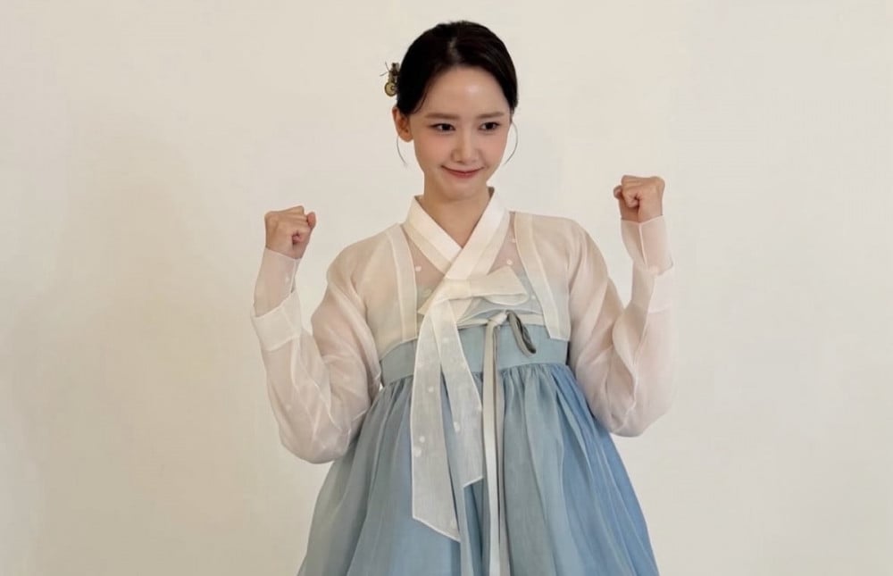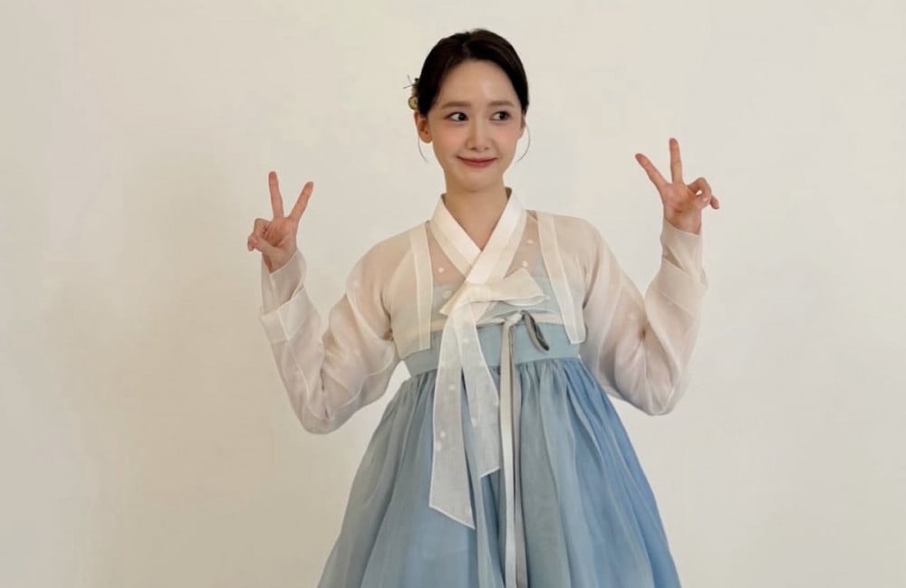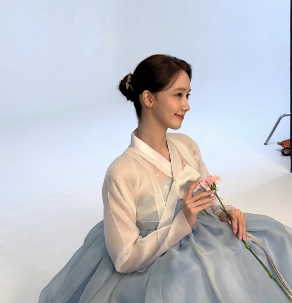 在公開的照片中,潤娥身穿傳統韓服,以白色短上衣搭配柔和的薄荷綠裙子,展現了優雅又可愛的魅力。在看似拍攝現場的環境中,她手持鮮花直視鏡頭,並擺出雙手置於額前、類似傳統行禮的姿勢,突顯出其優雅的儀態。