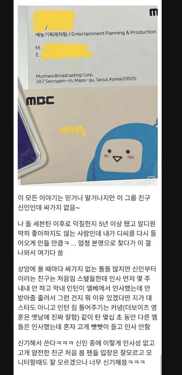在最初的指控傳開後不久,一名被認為是貼文中提及的女兒的當事人在網上現身,分享了據稱能證明她在MBC工作的證據。據報導,這些材料包括每週拍攝時間表和她的辦公桌照片。