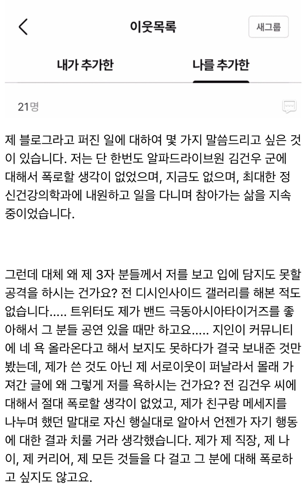 她寫道:「關於那篇被聲稱是我的部落格、正在流傳的貼文,有幾點我想澄清。我從未有意要揭露AlphaDriveOne的金建宇,現在也沒有這個意圖。我一直努力安靜地忍受生活,持續接受精神科治療並繼續上班。」
