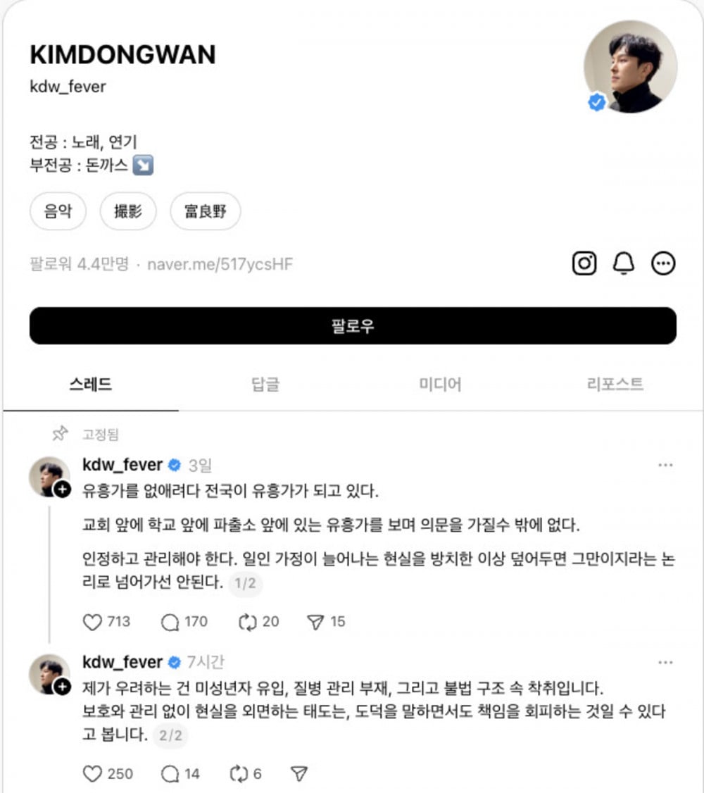 對此評論,金烔完回應:「你能更簡短地總結一下嗎?大約四行?」當另一位用戶表達複雜感受,寫道:「我感到矛盾。徵稅是好的,但我不確定合法化是否正確。」金烔完回覆:「我認為應該合法化的原因是,有些人如果不付錢就無法進行性行為。從疾病控制的角度來看也是必要的。」