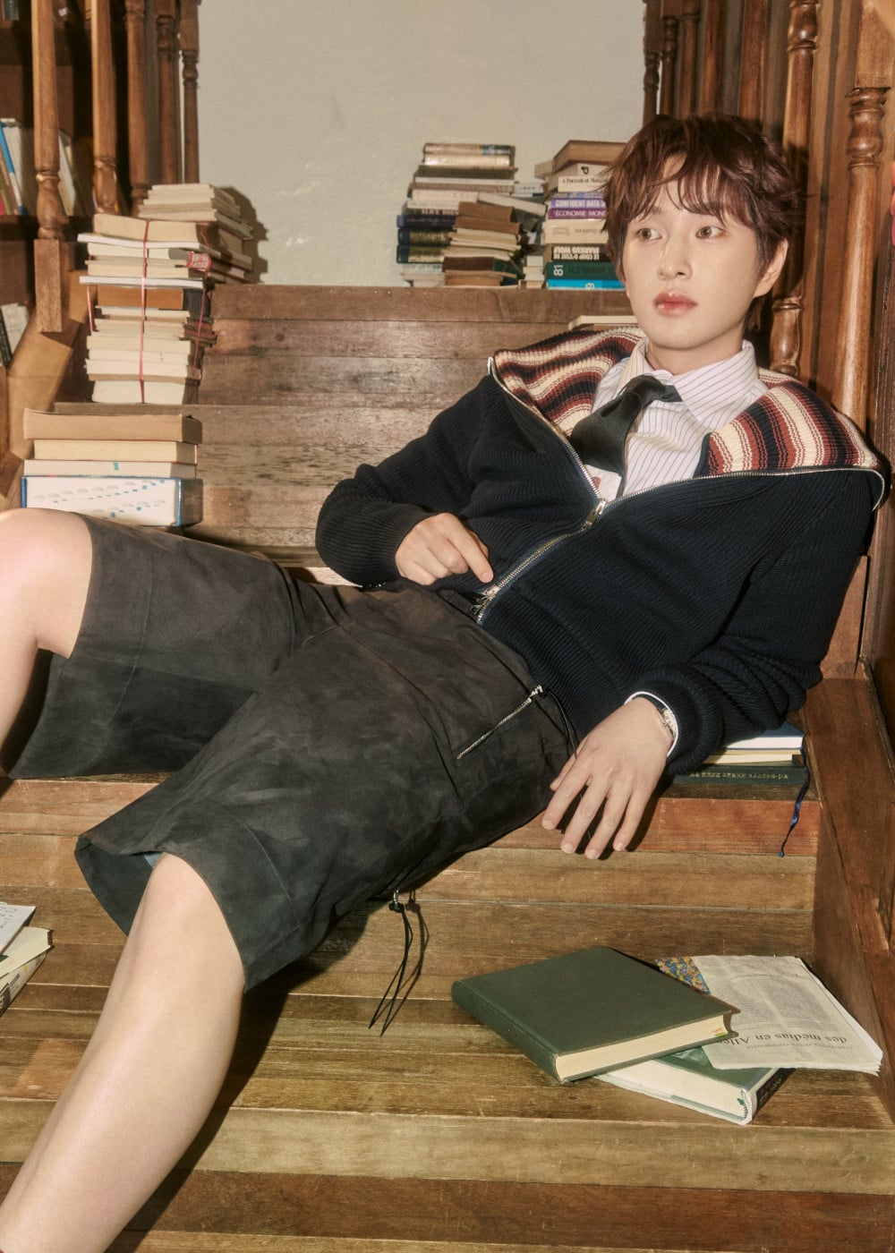在一組照片中,溫流身穿粉色針織毛衣,置身於粉色背景前,扮演了充滿撒嬌感的男友角色;而在另一組照片中,這位偶像則採用了書獃子般的時尚概念,置身於古色古香的圖書館書海之中。