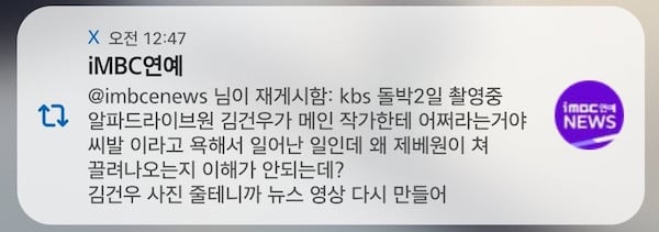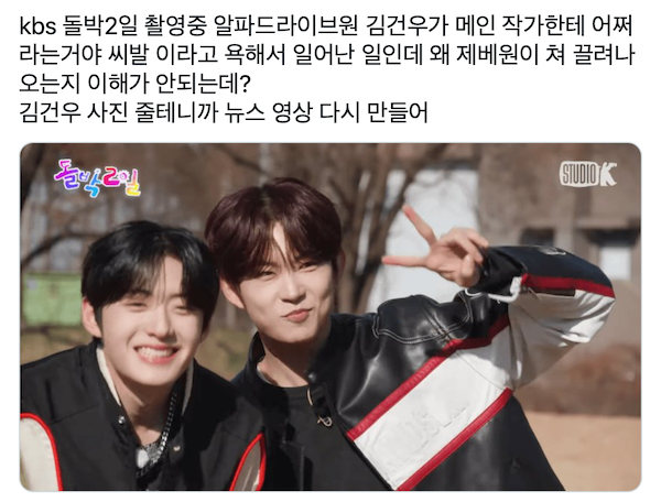 「這一切之所以發生,是因為ALPHA DRIVE ONE的金建宇對KBS2《Idol 1N2D》的主編劇罵了『他們他X的在說什麼?』,所以我不明白為什麼ZEROBASEONE要被拖下水?這裡是金建宇的照片,請修正你們的影片。」