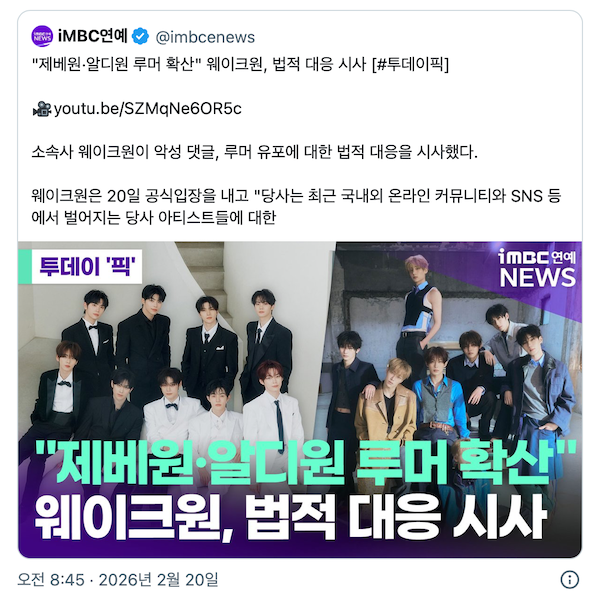 韓國時間2月20日稍早,針對ALPHA DRIVE ONE成員金建宇近期引發的爭議及其對電視台工作人員「態度粗魯」的傳聞,其所屬經紀公司Wake One Entertainment發表聲明,警告將對任何「侵害藝人權益」的行為採取法律行動。