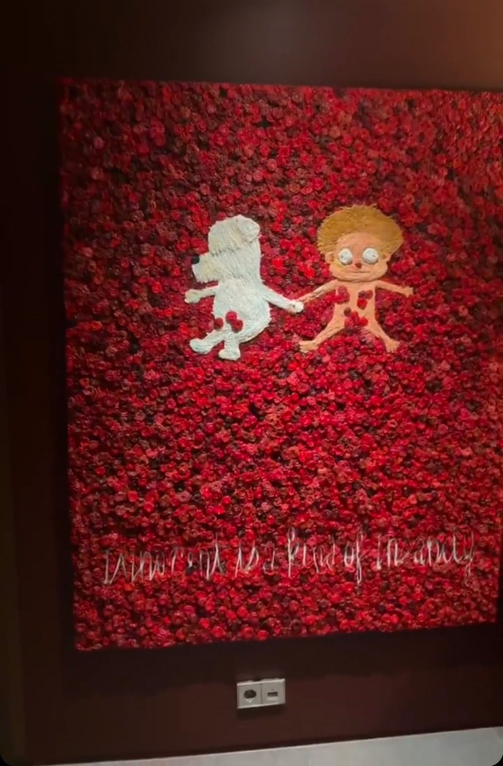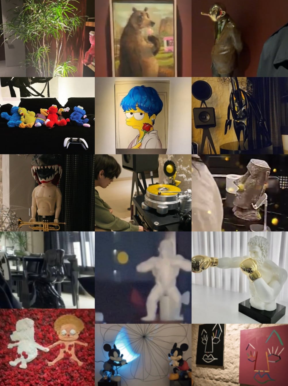 展示的物品包括:書架上的一隻粉色玩偶、一幅泰迪熊吃雪糕的畫作、藝術家禹國元(Woo Kuk Won)一幅似乎是向電影《美麗有罪》(American Beauty)海報致敬的作品、V 在Kiaf藝博會購買的皮諾丘(Pinocchio)雕像,以及一幅裱框的樂高藝術品。