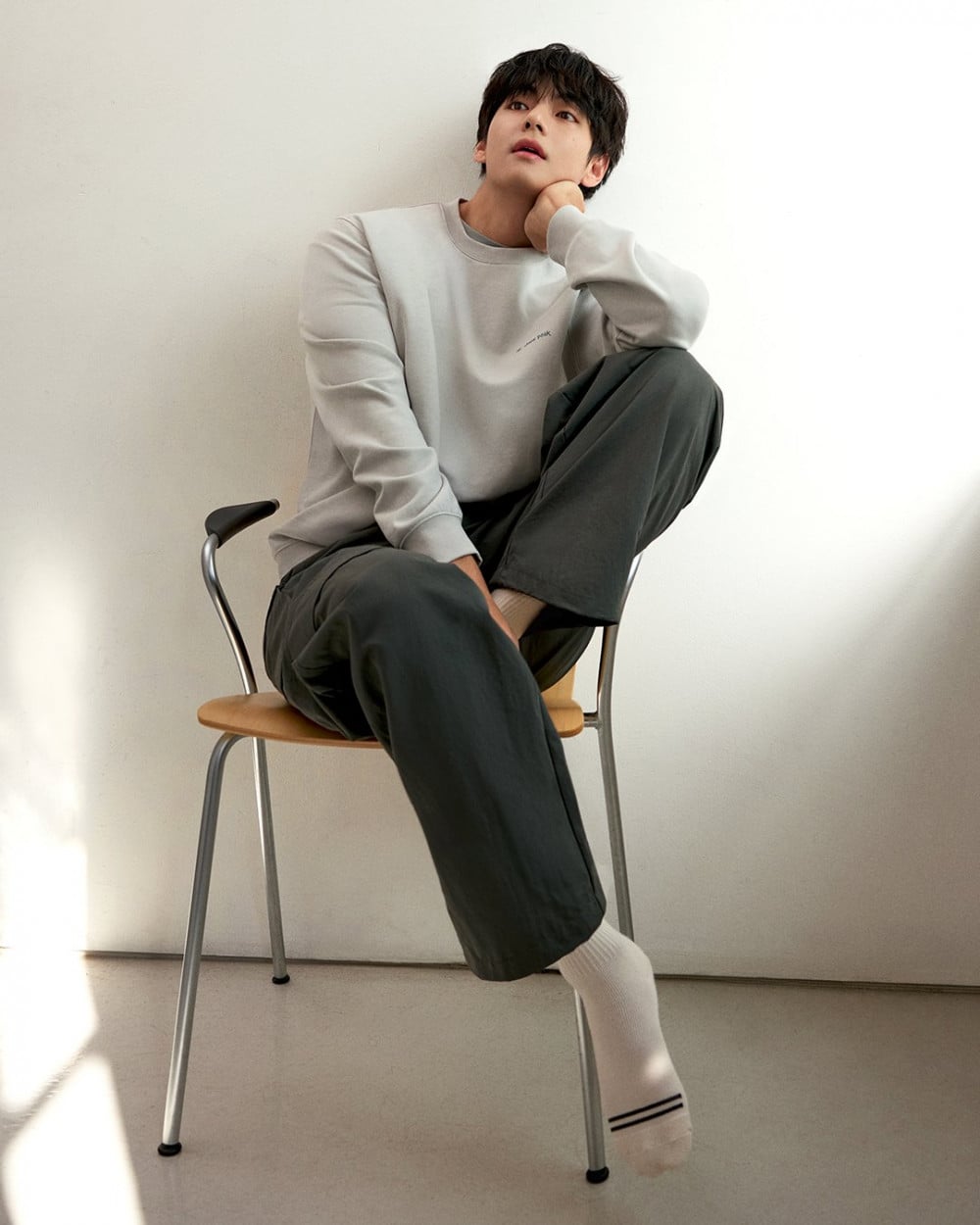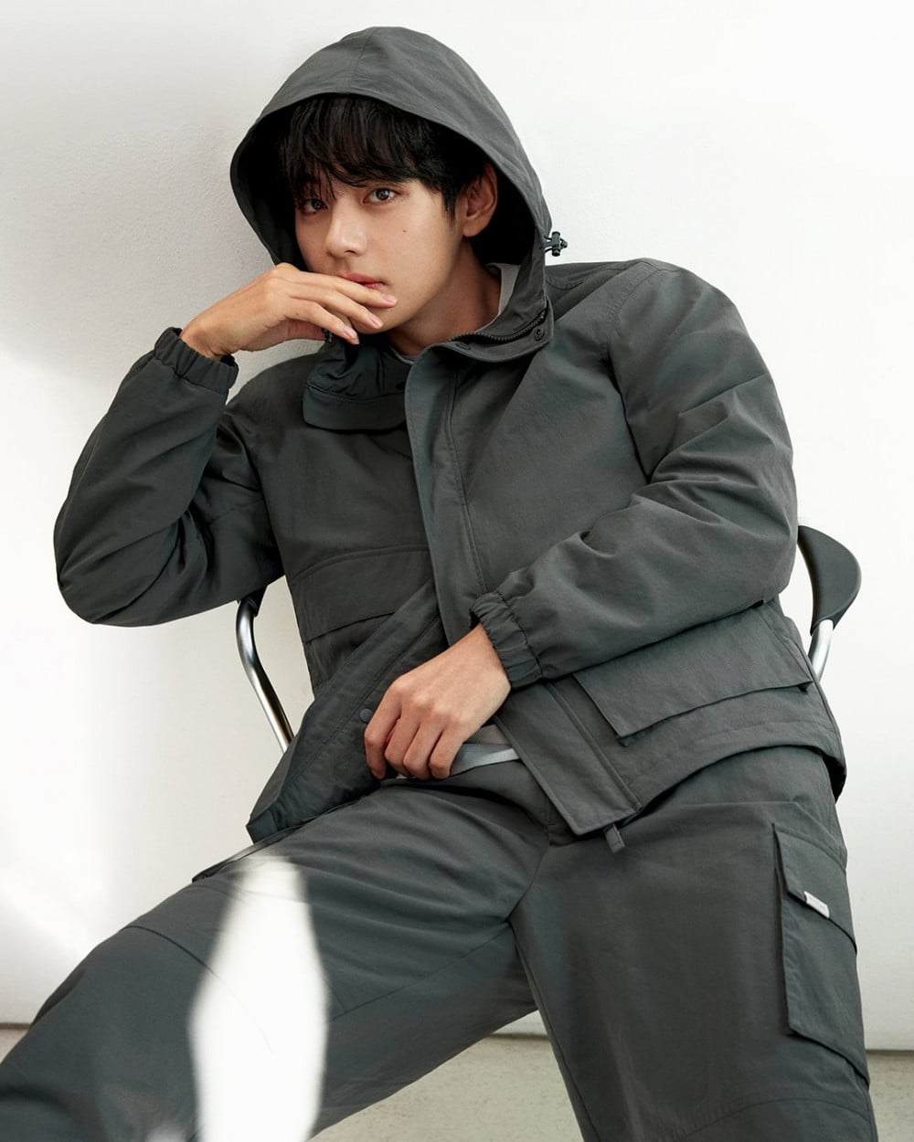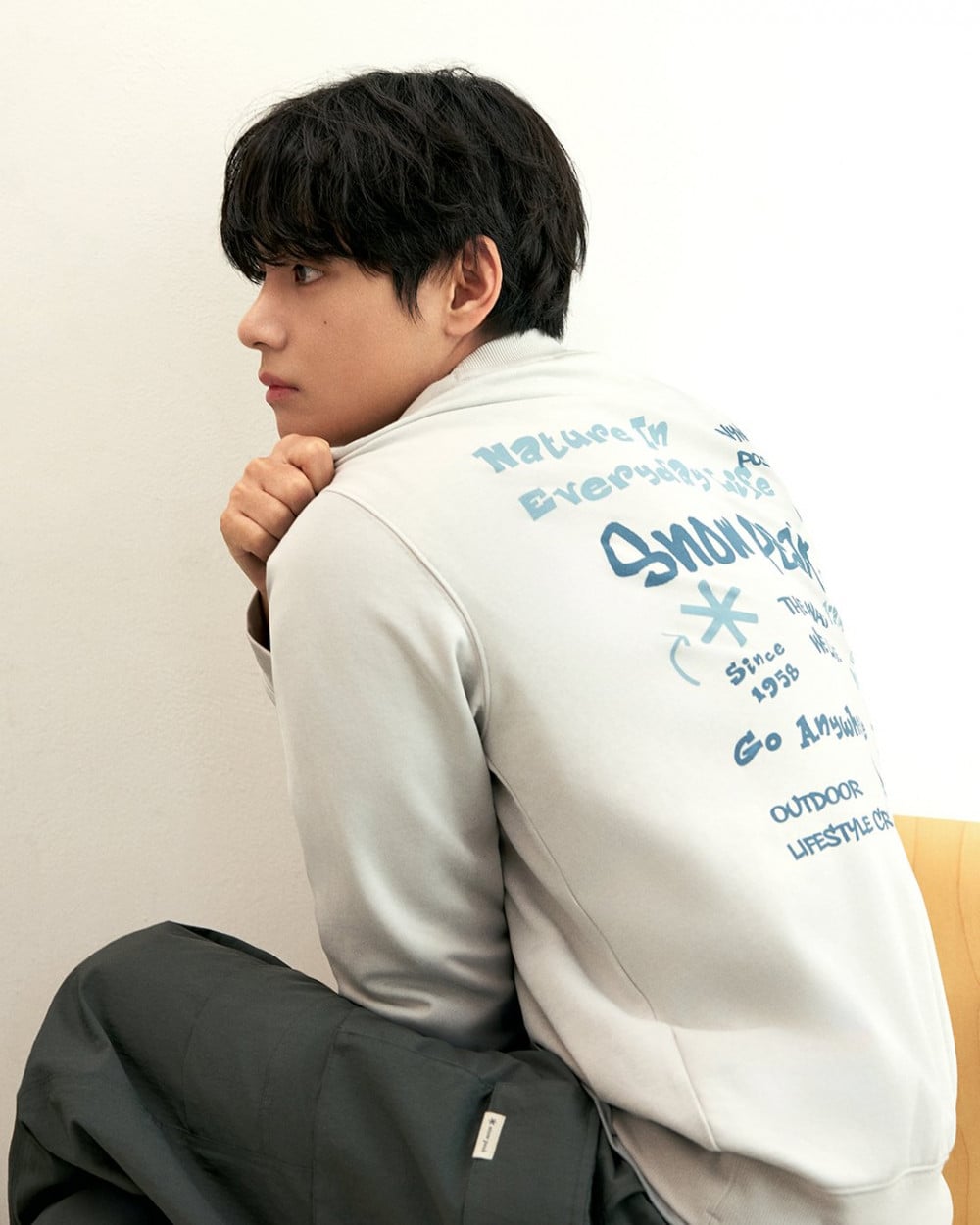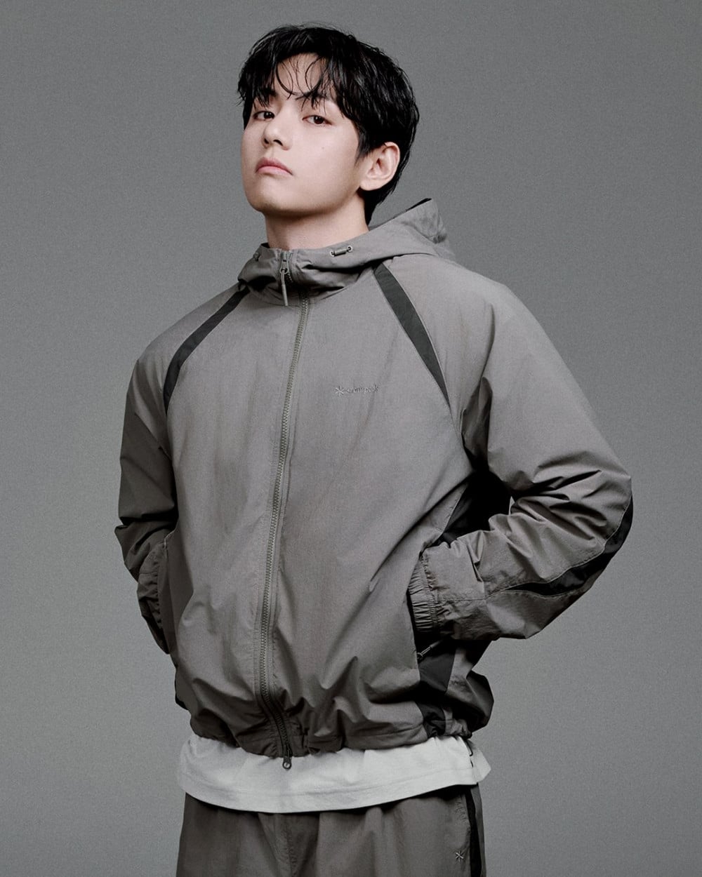 在畫報中,V以其酷帥的態度和放鬆的動作,完美詮釋了系列的核心理念。他低調的手勢與舒適自在的姿態,自然地展現了功能性與風格的融合,沉靜地傳遞出Snow Peak標誌性的極簡氛圍。