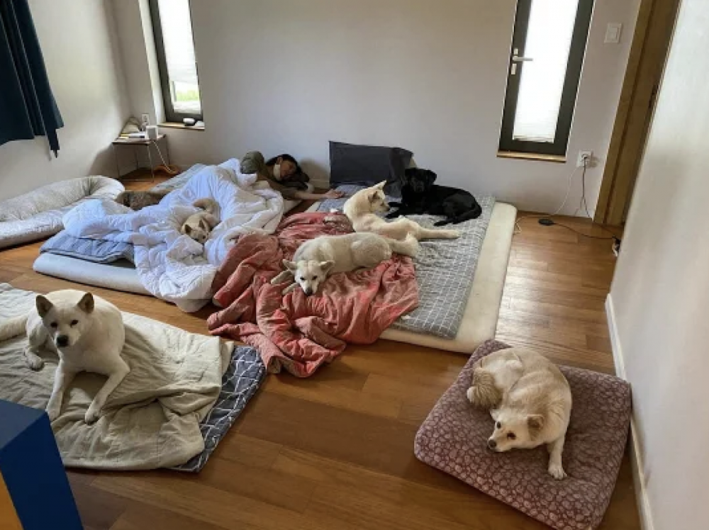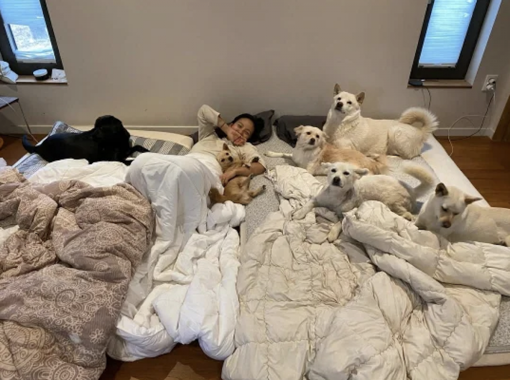 照片中可見毯子和地墊鋪滿地板,她的狗隻舒適地躺在不同位置。另一張照片中,李孝利躺在毯子上,懷中抱著其中一隻愛犬,享受寧靜時刻。這只是她日常生活簡單而真實的一瞥。