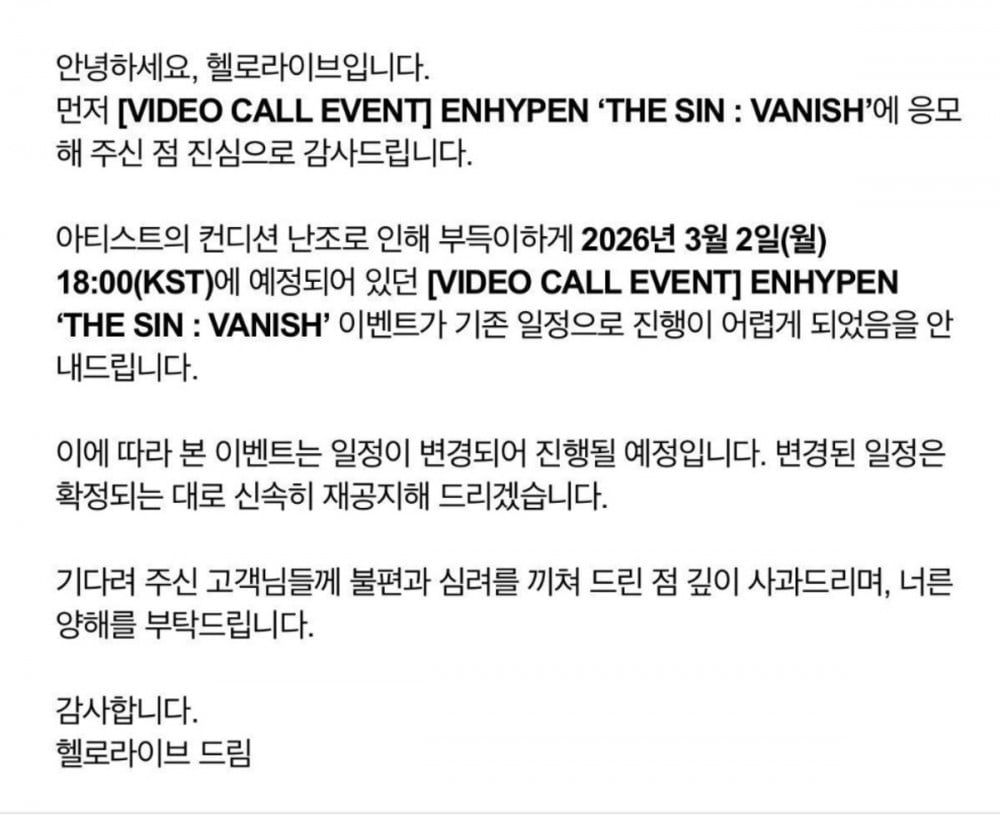 3月2日,全球粉絲活動平台HelloLive宣布,原定於當晚6時舉行的ENHYPEN視訊通話簽名會取消。平台解釋,活動開始前數小時,因成員健康狀況而決定取消,並指全體成員均受影響。HelloLive為此致歉,並承諾一旦確認新日期將盡快公布。