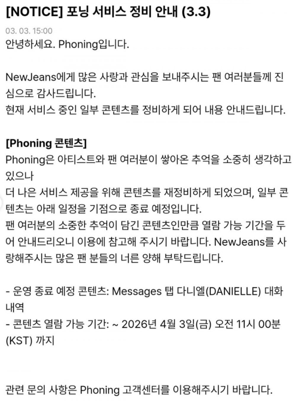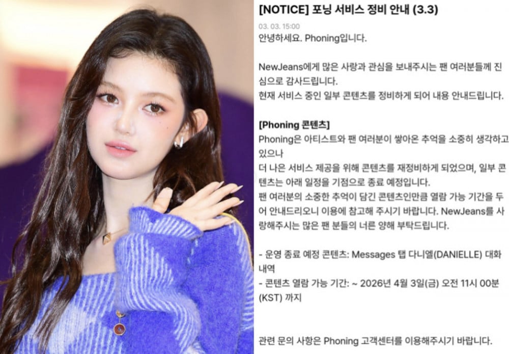 Phoning補充說明,由於這些內容包含了粉絲們珍視的回憶,在移除前會設定一段指定的瀏覽期。具體而言,與Danielle在「Messages」標籤頁中的對話記錄將於4月3日上午11時起不再提供。平台請求粉絲們的理解,並繼續支持NewJeans。此舉正值Danielle與ADOR之間持續的法律糾紛之際。