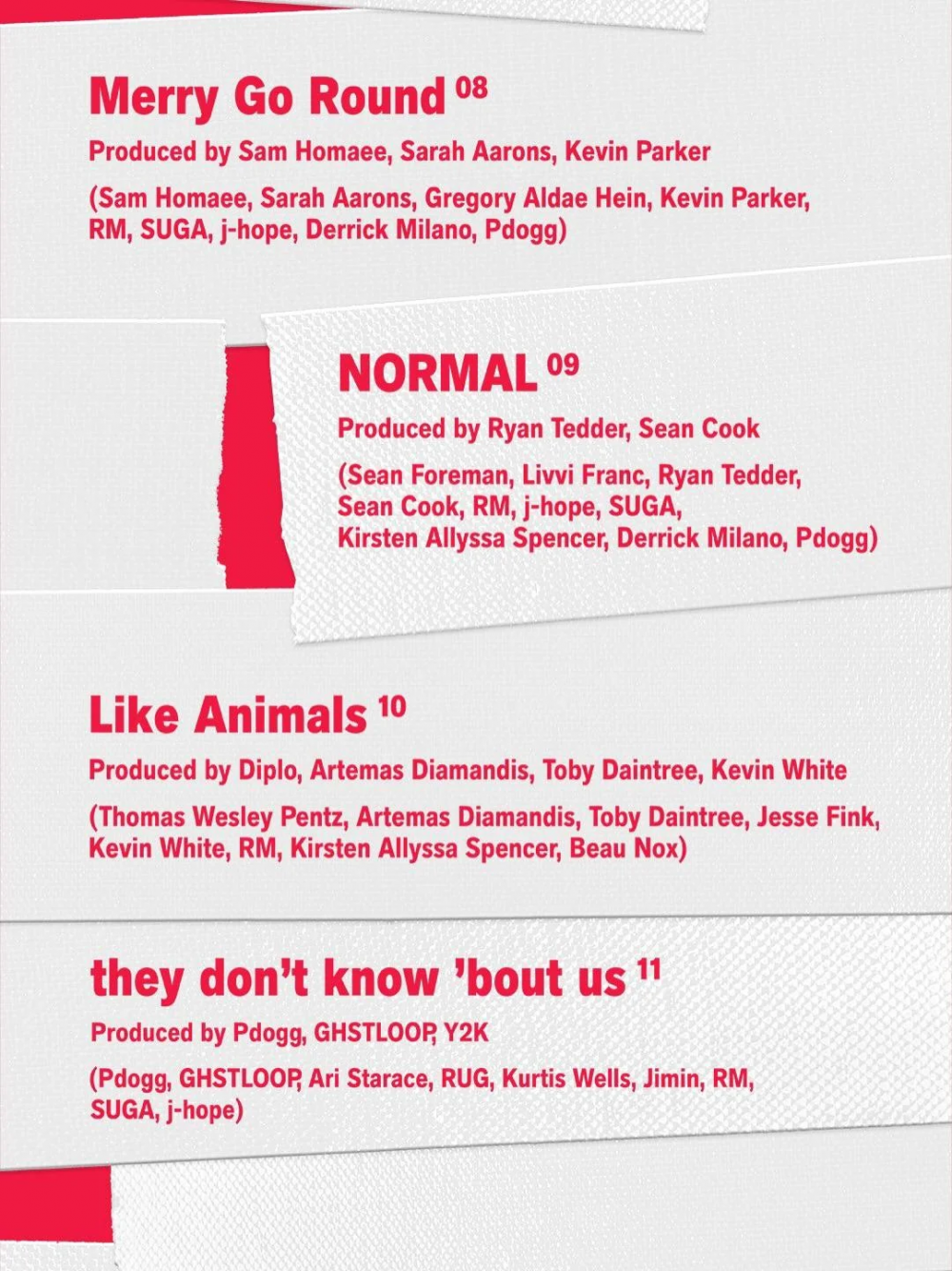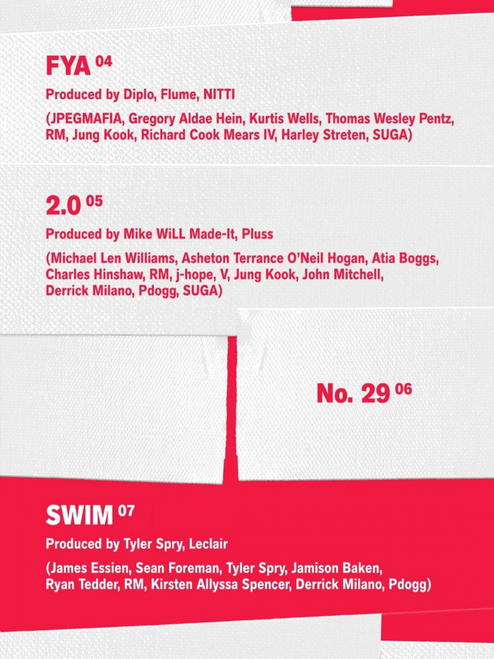 韓國時間3月4日凌晨,團體公開了曲目列表及製作名單預告,揭露了《ARIRANG》的詳細資訊。根據曲目列表,專輯包含14首歌曲:〈Body to Body〉、〈Hooligan〉、〈Aliens〉、〈FYA〉、〈2.0〉、〈No. 29〉、〈SWIM〉、〈Merry Go Round〉、〈NORMAL〉、〈Like Animals〉、〈They Don't Know 'Bout Us〉、〈One More Night〉、〈Please〉以及〈Into the Sun〉。