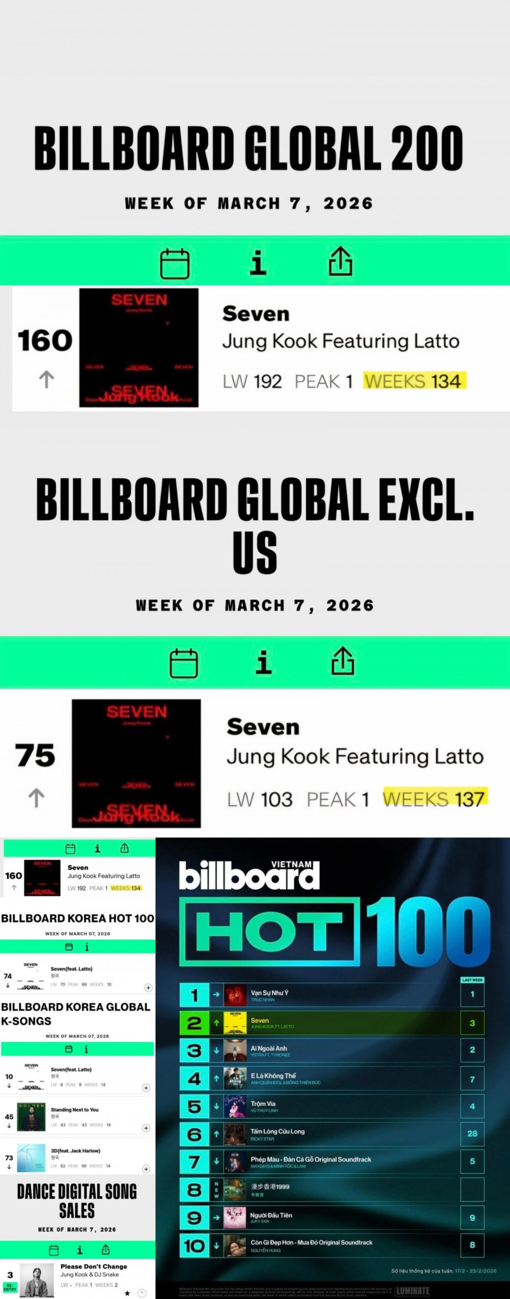 根據 Billboard 於 3 月 7 日公佈的榜單,柾國的《Seven》在 Global 200 榜單中排名第 160 位。