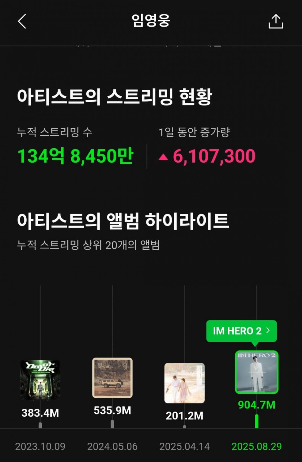 根據Melon於3月8日的數據,林英雄第二張正規專輯《IM HERO 2》收錄的11首歌曲,在該平台的累計串流量已突破9億次。這項成就反映了其粉絲團「英雄時代」持續的串流支持,以及專輯在聽眾間的廣泛人氣。