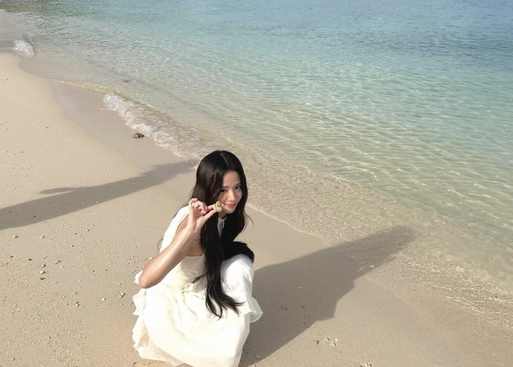 照片中,智秀身穿白色長裙,與明亮的藍色海洋完美相襯,營造出清爽的度假氛圍。她優雅又休閒的造型,突顯了海邊的風景背景。