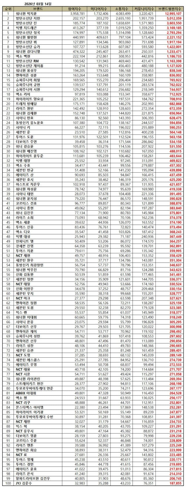 從韓國標準時間2月14日至3月14日,韓國品牌聲譽指數分析了755位男K-Pop偶像在消費者參與度、媒體活動、溝通及社群活動等領域的大數據。分析結果發現,消費者參與度較上月增長了42.80%,而朴志訓的個人品牌參與度更從二月起飆升了3,129.24%。