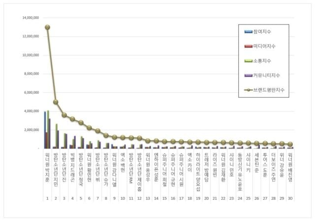 與此同時,本月品牌聲譽排名前30位的個人男K-Pop偶像分別是:朴志訓、BTS的Jimin、BTS的Jin、G-Dragon、BTS的Jungkook、黃旼炫、BTS的V、BTS的SUGA、姜丹尼爾、EXO的伯賢、BTS的RM、邕聖祐、ENHYPEN的成訓、Super Junior的希澈、Super Junior的圭賢、Super Junior的始源、EXO的Kai、Highlight的梁耀燮、方藝潭、RIIZE的元彬、金在煥、SHINee的珉豪、TVXQ的允浩、SHINee的Key、Seventeen的Jun、TWS的度勳、The Boyz的周延、WINNER的姜昇潤,以及裴珍映。