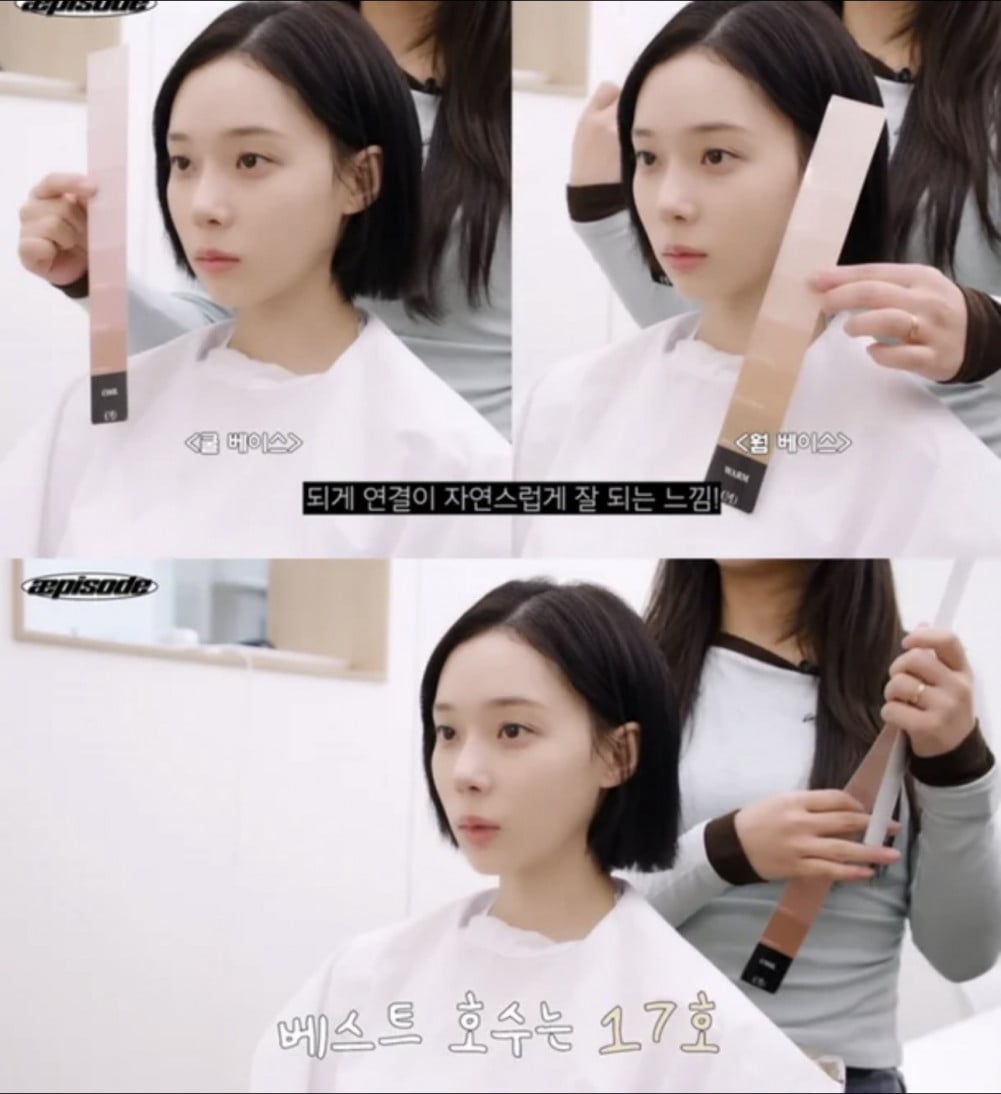 隨著全面診斷開始,緊接著進行了膚色分析。專家解釋道:「暖色基底很自然地適合你」,並補充說:「由於你的膚色明亮,使用氣墊粉底時,我推薦像17號這樣較淺的色號,而不是20號。」