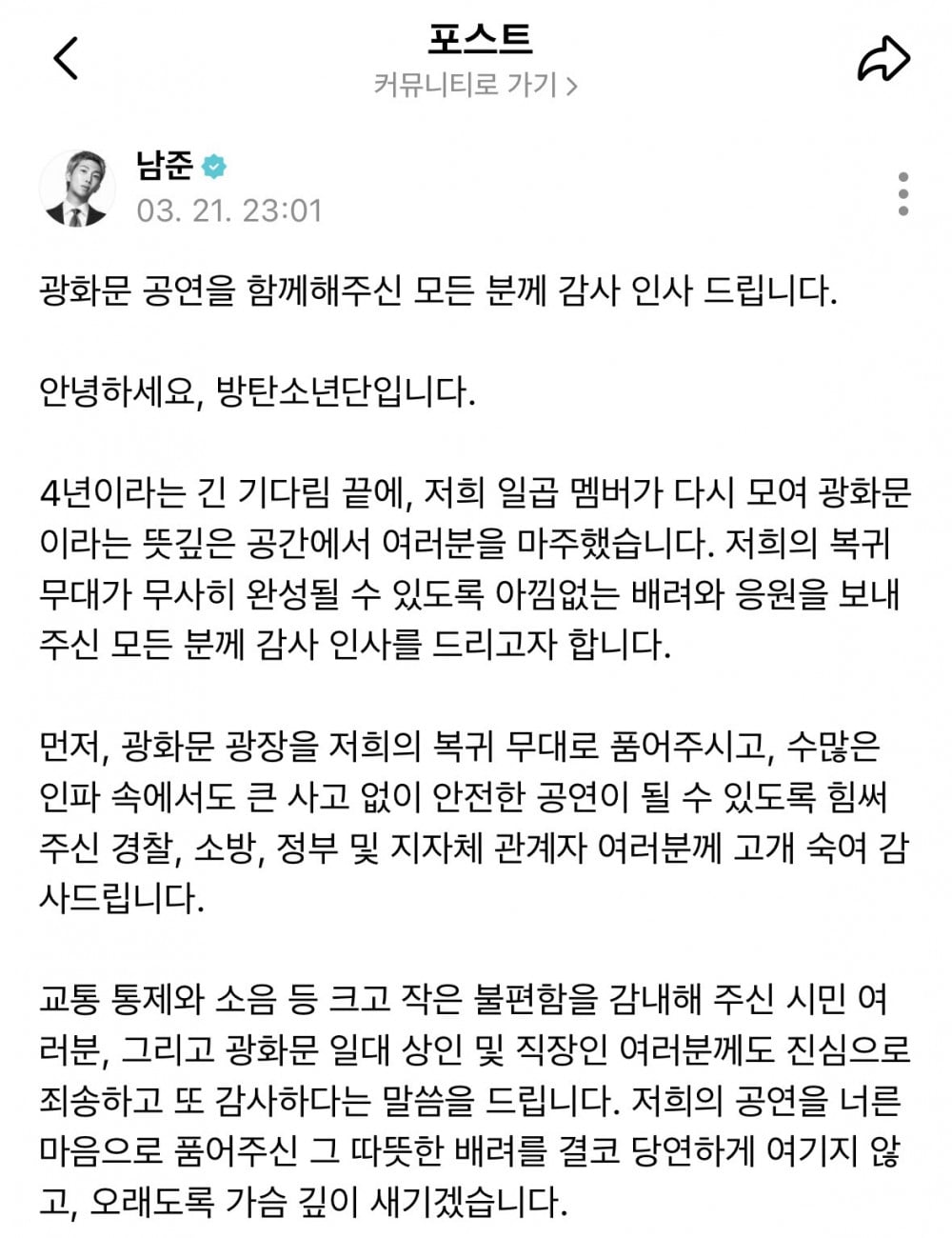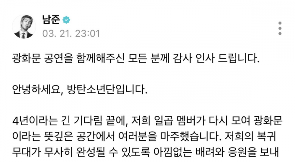 經過4年的漫長等待,我們七位成員在這個名為光化門的意義深遠之地重聚,與大家見面。我要感謝所有給予我們毫不吝嗇的體諒與支持,讓我們的回歸舞台得以安全完成的人。