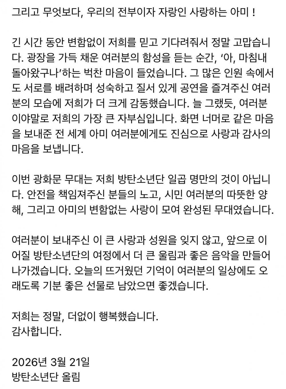非常感謝你們在如此漫長的時間裡,始終相信我們,並以不變的心等待我們。當我們聽到你們的歡呼聲響徹廣場的那一刻,心中充滿了「啊,我們終於回來了」的感慨。看到你們在如此龐大的人群中,仍能以成熟有序的方式享受演出,彼此體諒,我們深受感動。一如既往,你們是我們最大的驕傲。我們也向全球透過螢幕與我們共享此刻心情的ARMY,獻上真摯的愛與感謝。