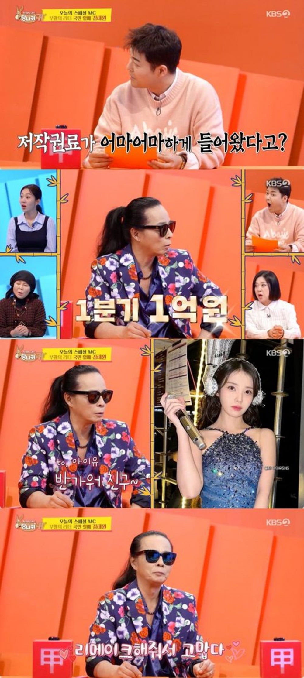 主持人向他道賀,並問到他最賺錢的歌曲。他選擇了經典名曲《Never Ending Story》和《The More I Love》。主持人隨後提到IU去年翻唱的《Never Ending Story》,並詢問這為他帶來了多少版稅收入。金泰元誠實地透露,僅一個季度就從她的翻唱中賺取了1億韓元,讓所有人感到驚訝。