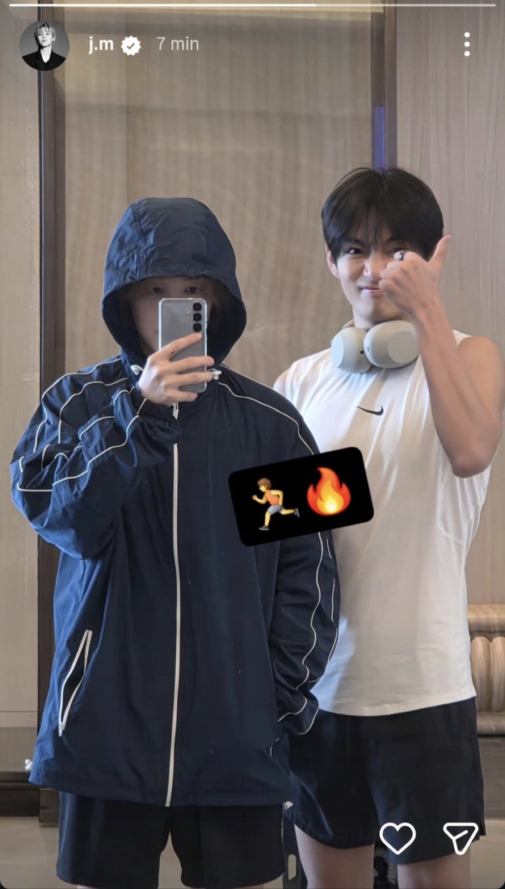 他上傳了健身時的自拍照,包括與成員V一同跑步的片段,顯示他正透過持續運動來維持健康與體能。