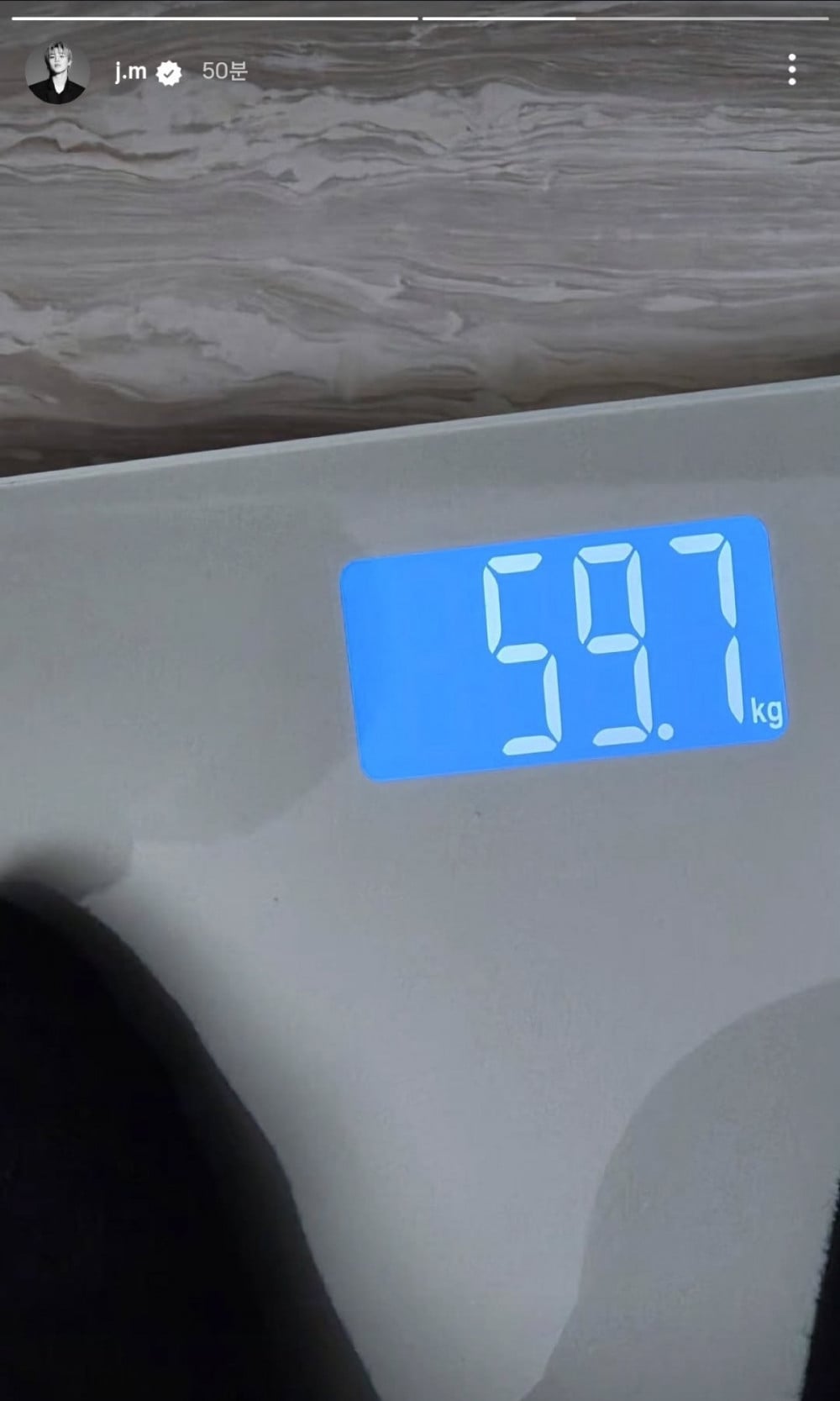 韓國時間3月25日,Jimin透過社交媒體上傳了一張自己站在體重秤上的照片。圖片顯示他的體重為59.7公斤。