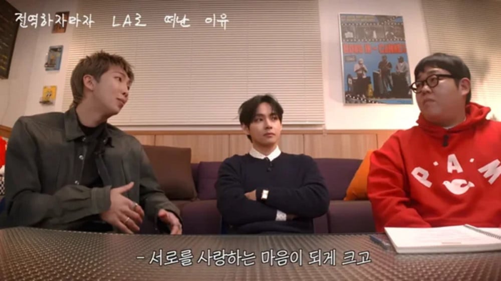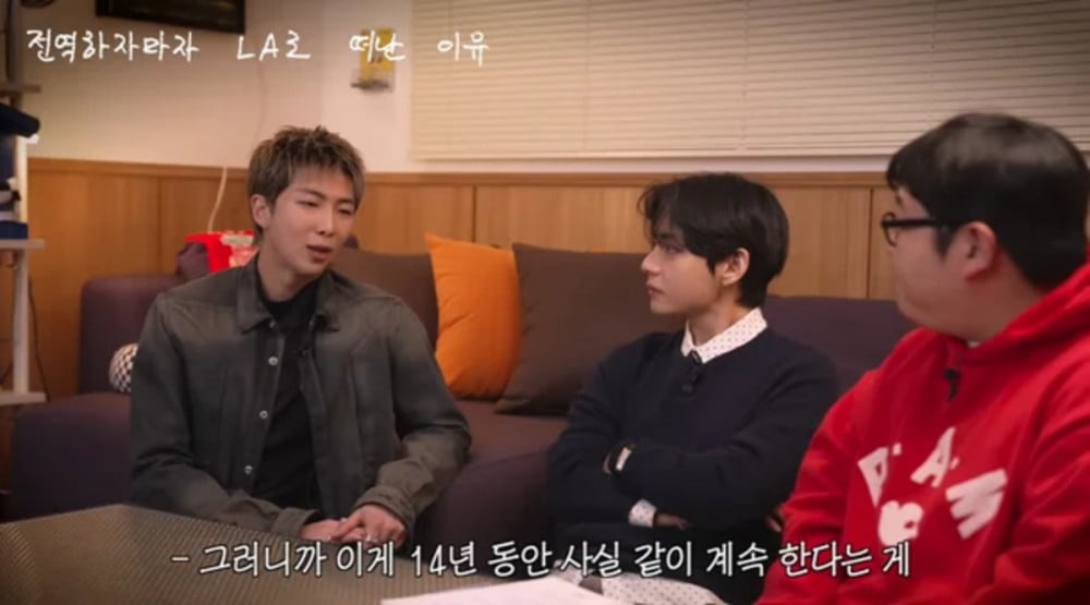 在談到為何團體在RM退伍後立即前往洛杉磯錄音時,他表示:「在我退伍後,我們馬上提議一起去洛杉磯進行兩個月的錄音工作,來製作我們的專輯。」他回憶起在2018或2019年,成員們各自進行個人活動後,他們曾一起租房子住。他補充道:「時隔七年再次一起生活,感覺非常棒。七個男人同住一個屋簷下,尤其是在已經和軍中大約20人一起生活過之後,本來可能會覺得不自在,但再次經歷這一切,一起處理所有事情,實際上真的非常美好。」