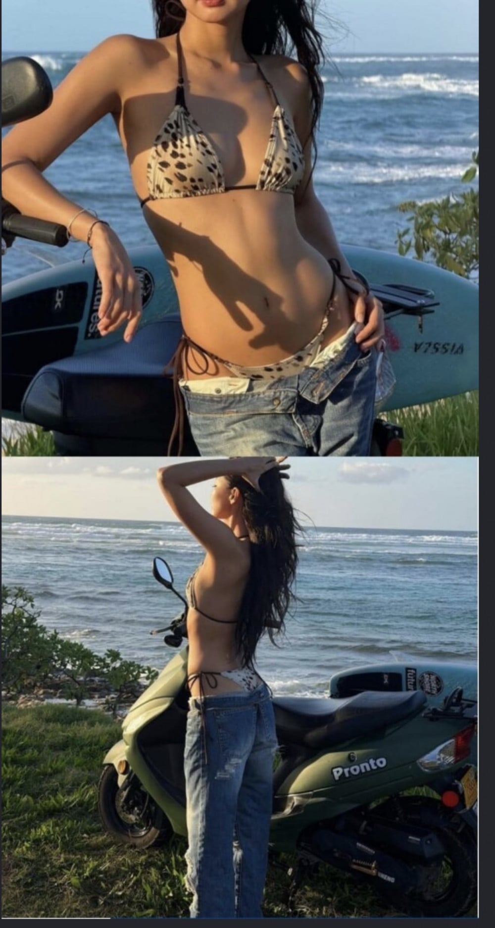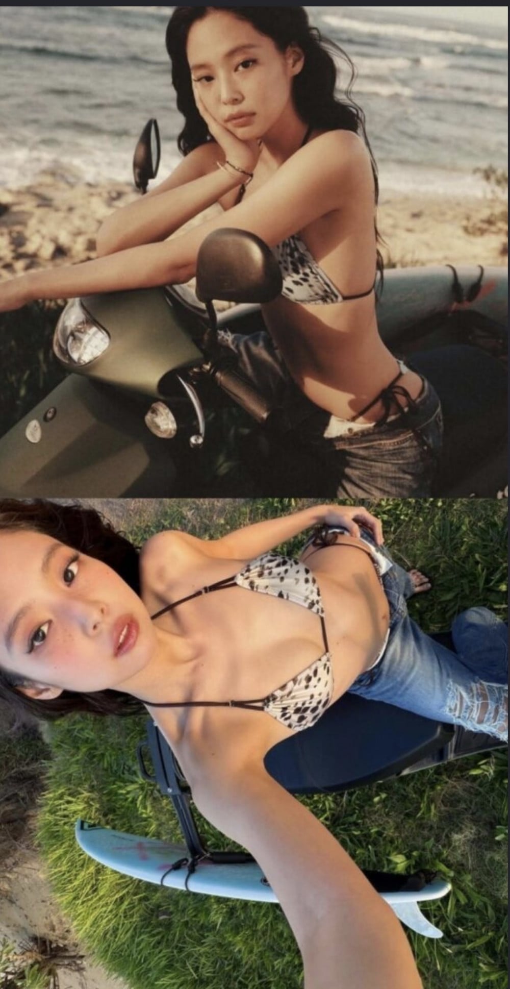 在公開的照片中,Jennie將比基尼與牛仔褲搭配,展現了精緻的風格,營造出她標誌性的慵懶而精緻的氛圍。她迷人又健康的身體線條,加上攝人心魄的眼神,展現出超越一般模特的深度,突顯了她作為藝術家的存在感。