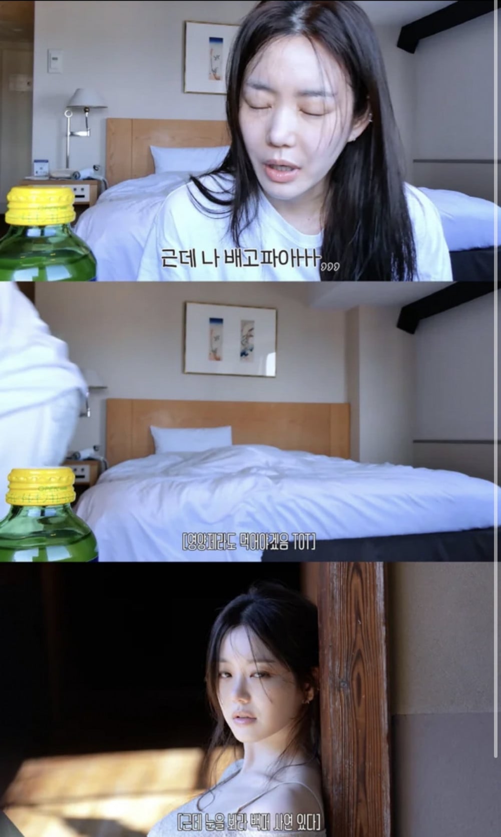 她說著「啊…我好餓」,緊緊閉上眼睛,表現出不適。接著她補充道:「出門前我會先吃益生菌」,透過攝取益生菌和維他命來緩解飢餓感,而非進食。