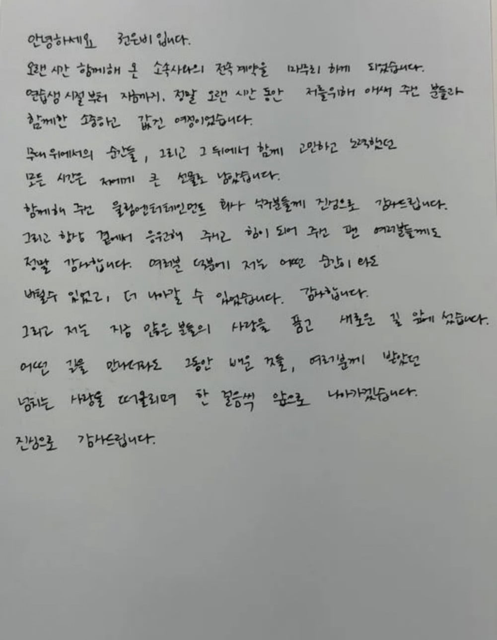 權恩妃寫道:「我與合作已久的經紀公司合約已經結束。」並補充說:「從練習生時期到現在,這是一段與為我辛勤付出的人們共度的、非常有意義且寶貴的旅程。」