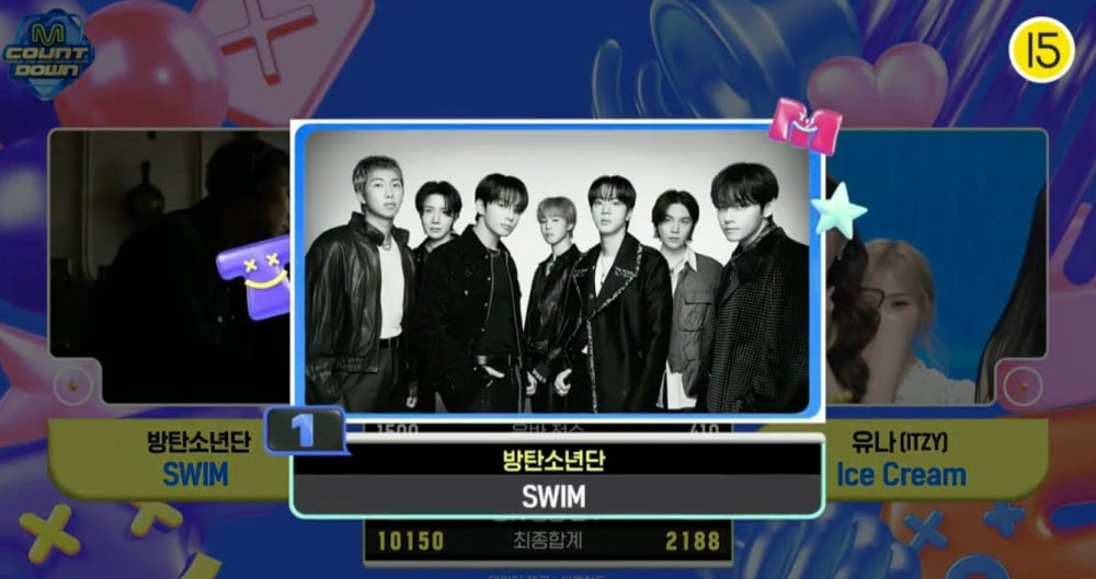 在4月2日播出的《M! Countdown》中,BTS的《SWIM》和Yuna的《Ice Cream》入圍了第一名候選。經過最終統計,BTS以驚人的10,150分奪得榜首,而Yuna的《Ice Cream》則以2,188分位居第二。值得注意的是,BTS在當天沒有出演節目的情況下,依然保持了連勝紀錄。