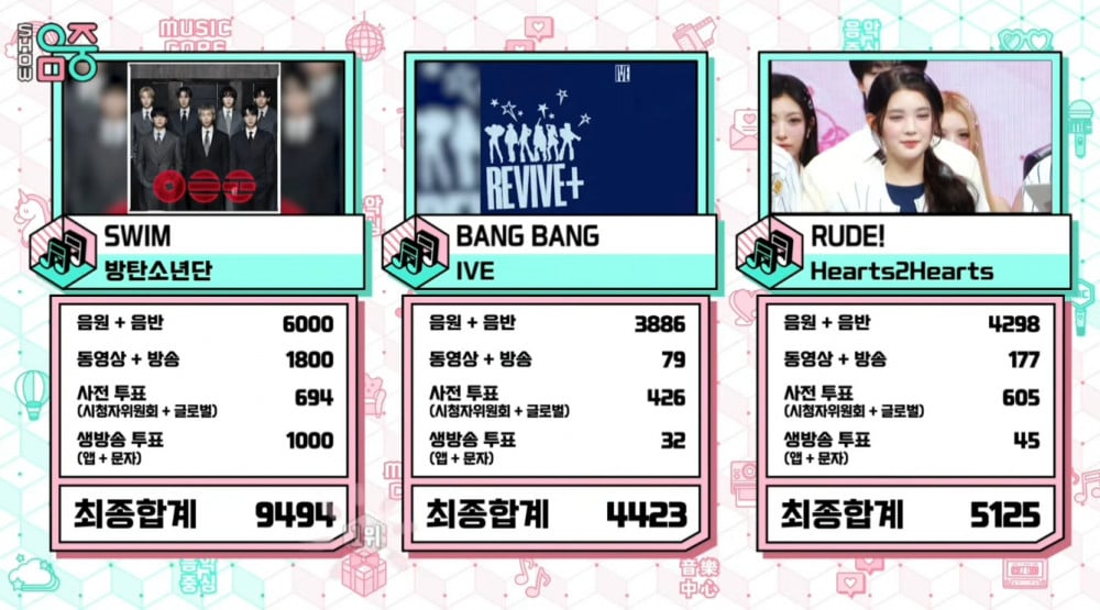 在4月4日的《Show! 音樂中心》中,冠軍之爭相當激烈。前三名候補包括BTS的《SWIM》、IVE的《BANG BANG》以及Hearts2Hearts的《RUDE!》。
