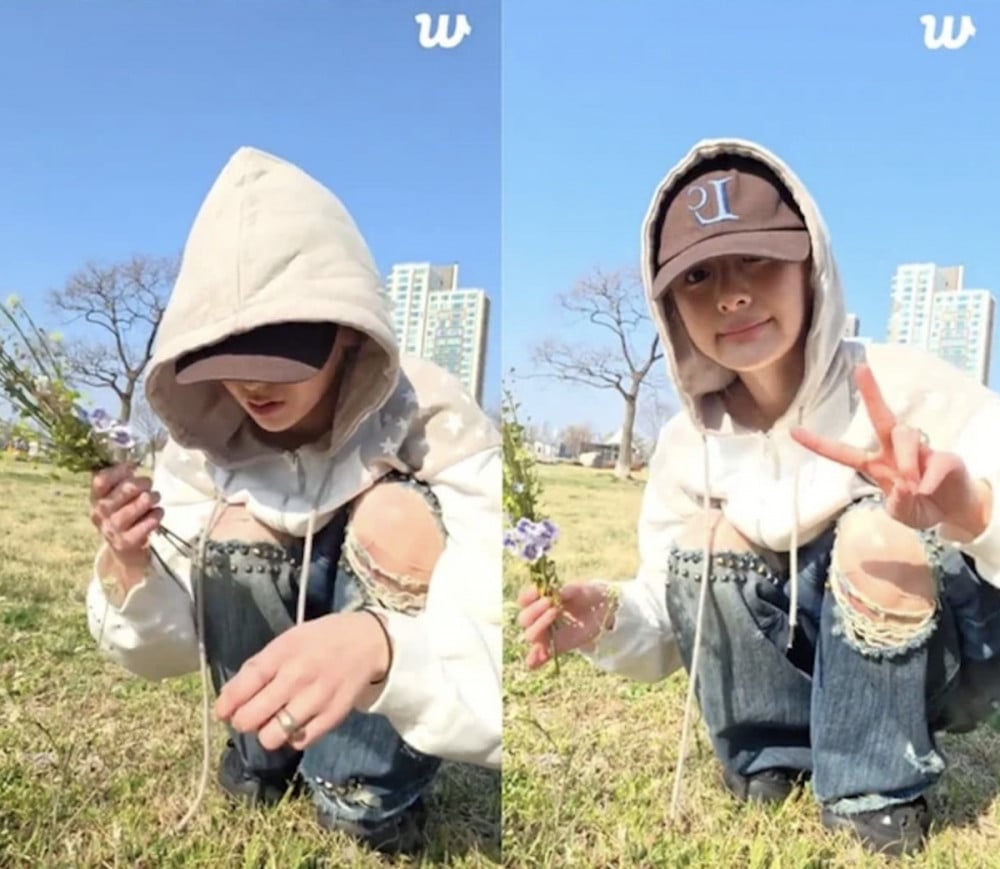 直播期間,她評論道:「天氣真好。我來到漢江了。人很多,很難找到好位置,但我看到一些花,所以我想摘一些來做花束。」