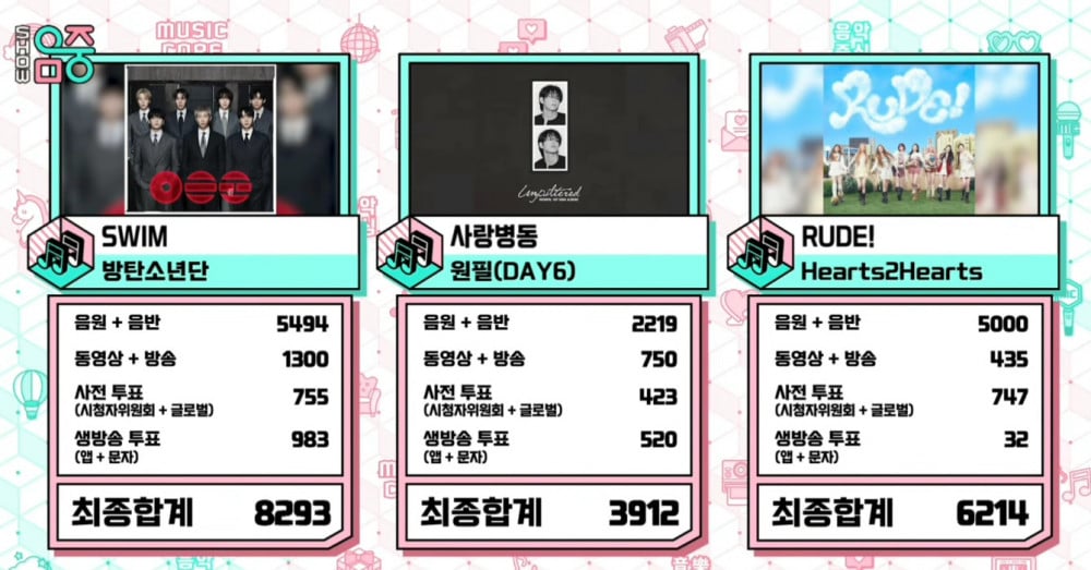 在4月11日的節目(MBC)中,角逐第一名的三位候選者分別是 BTS 的 〈SWIM〉、Wonpil 的 〈Highs and Lows〉,以及 Hearts2Hearts 的 〈RUDE!〉。經過最終分數統計,BTS 以總分 8,532 分奪冠。儘管團體並未出現在直播中,〈SWIM〉 仍以強勁的 8,293 分拿下第一名。Hearts2Hearts 以 6,214 分位居第二,而 Wonpil 則以 3,912 分獲得第三名。