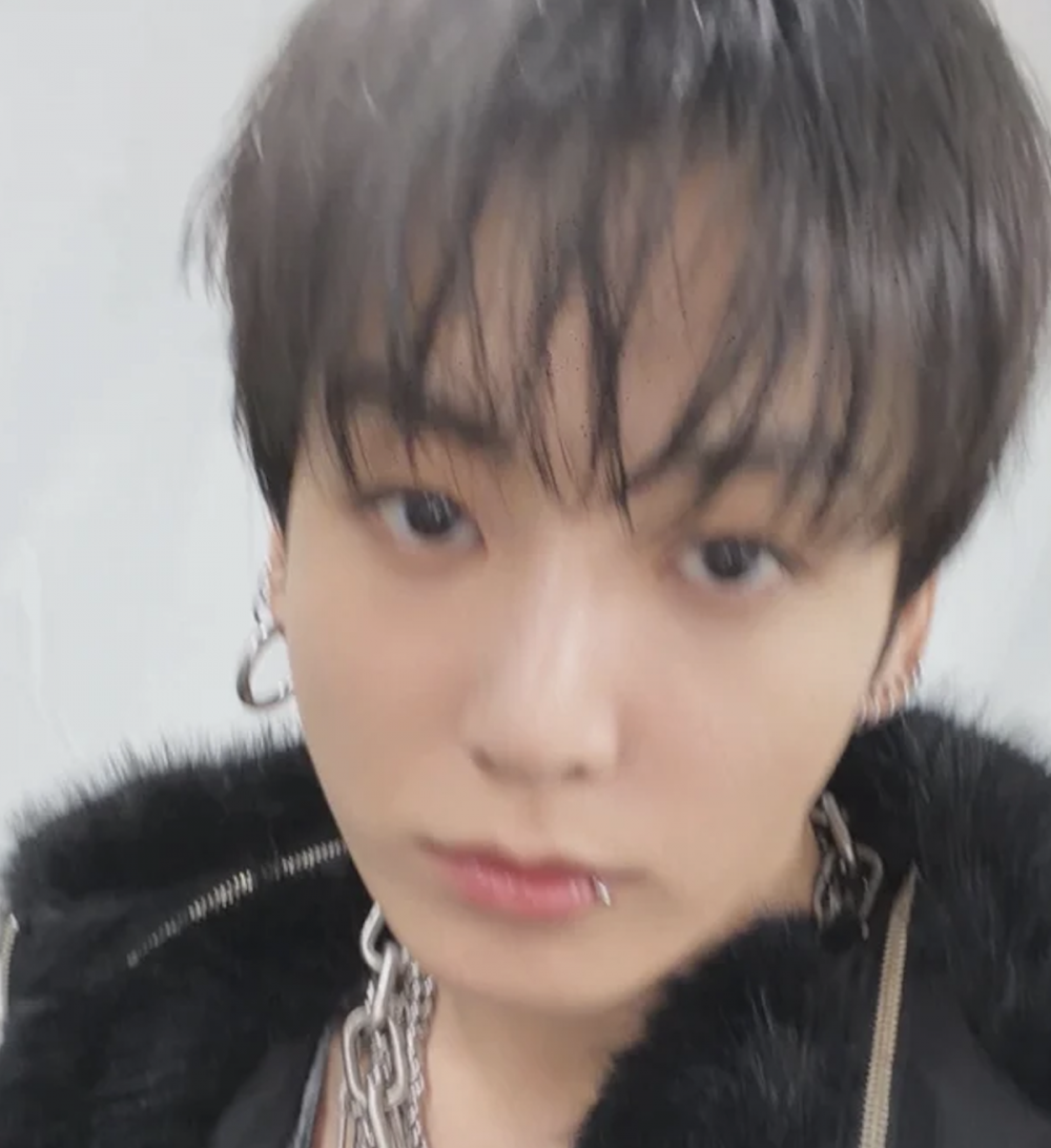 照片中,柾國穿著舞台服裝,略帶嘟嘴的表情看著鏡頭。儘管焦點有些模糊,但他分明的五官和標誌性的氣場依然突出。