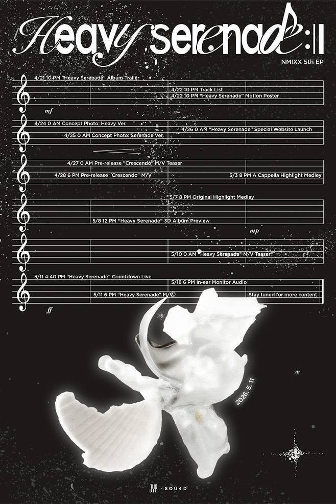 NMIXX 正式確定將於2026年首次回歸。韓國時間2026年4月14日,JYP娛樂透過社群媒體發布了宣傳行程表,確認團體將於5月11日發行第五張迷你專輯 《Heavy Serenade》。此次發行距離她們上一次的作品約相隔7個月。行程表本身透過融合五線譜與音符的設計,暗示了專輯的概念。從4月21日開始,NMIXX 將陸續釋出一系列宣傳素材,包括專輯預告、曲目列表、動態海報以及3D專輯預覽,為新篇章預熱。