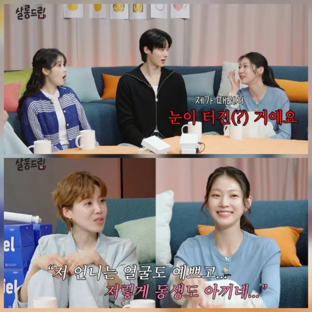 談到兄弟姐妹關係時,IU坦承:「說實話,我小時候經常打弟弟。」孔升妍笑著回應:「我也經常打我的弟弟妹妹,兩個都打。」她補充道:「我大妹妹(定延)只比我小一歲,每當定延想向媽媽告狀說我們在打架時,她反而會被電話砸到。」