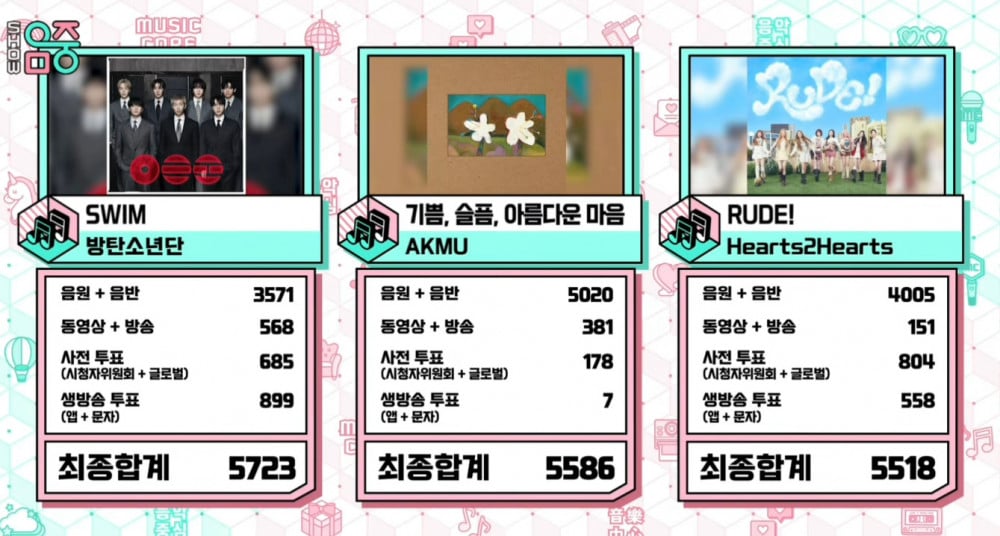 Hearts2Hearts 的《RUDE!》以總分5,518分排名第三,而 AKMU 的 《Joy, Sorrow, A Beautiful Heart.》則以5,586分獲得第二名。BTS 最終憑藉《SWIM》以5,723分奪得第一名。
