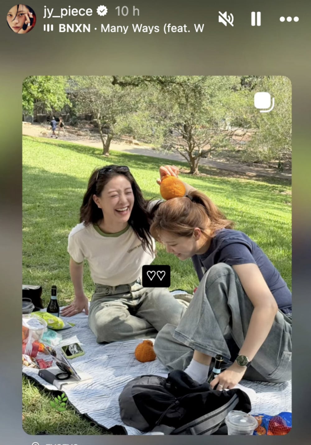 一個特別俏皮的瞬間吸引了粉絲注意:志效將一顆漢拏峰柑橘放在定延頭頂上保持平衡,引發笑聲並展現了她們輕鬆愉快的相處模式。兩位明星看起來放鬆又開心,笑容燦爛,凸顯了彼此的親密友誼。