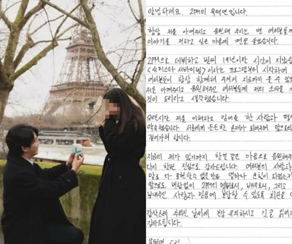 據4月21日報導,這位2PM成員兼演員近日在婚禮前向親友及家人分享了喜帖。喜帖上寫著:「彼此都是滿分10分的兩個人終於要結婚了。請來見證這段旅程的開始」,引用了2PM的熱門歌曲「10 out of 10」。