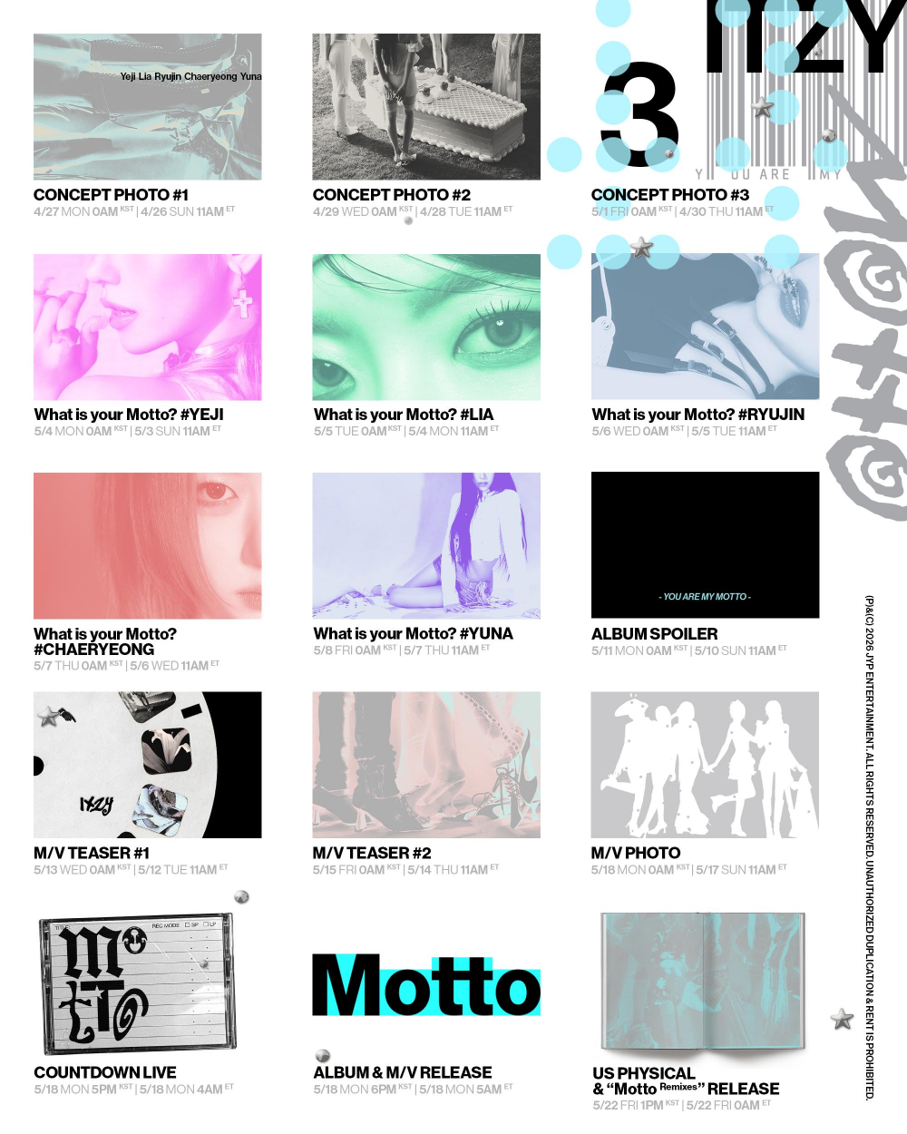 ITZY 公開了第12張迷你專輯《Motto》的回歸行程表,標誌著又一輪令人興奮的宣傳活動正式開始。