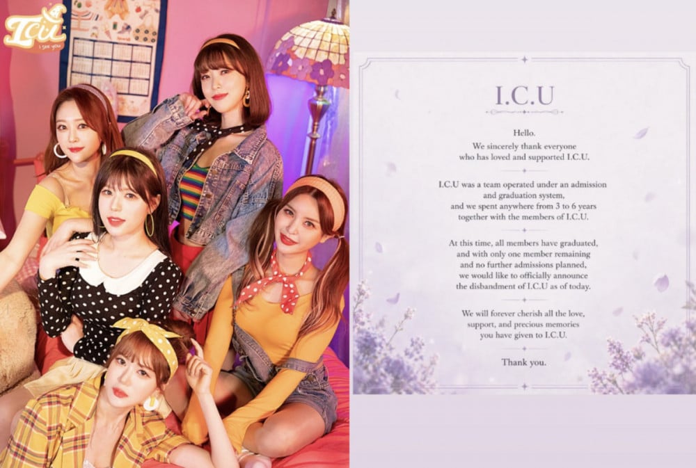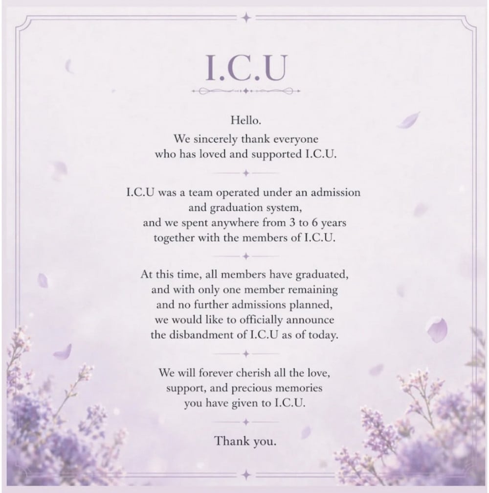 公司表示:「I.C.U 是一個以入學與畢業制度運作的團隊,我們與成員們共同度過了 3 到 6 年的時間。目前所有成員均已畢業,只剩下一位成員,且沒有計劃再招收新成員,因此我們謹此正式宣佈 I.C.U 即日起解散。」