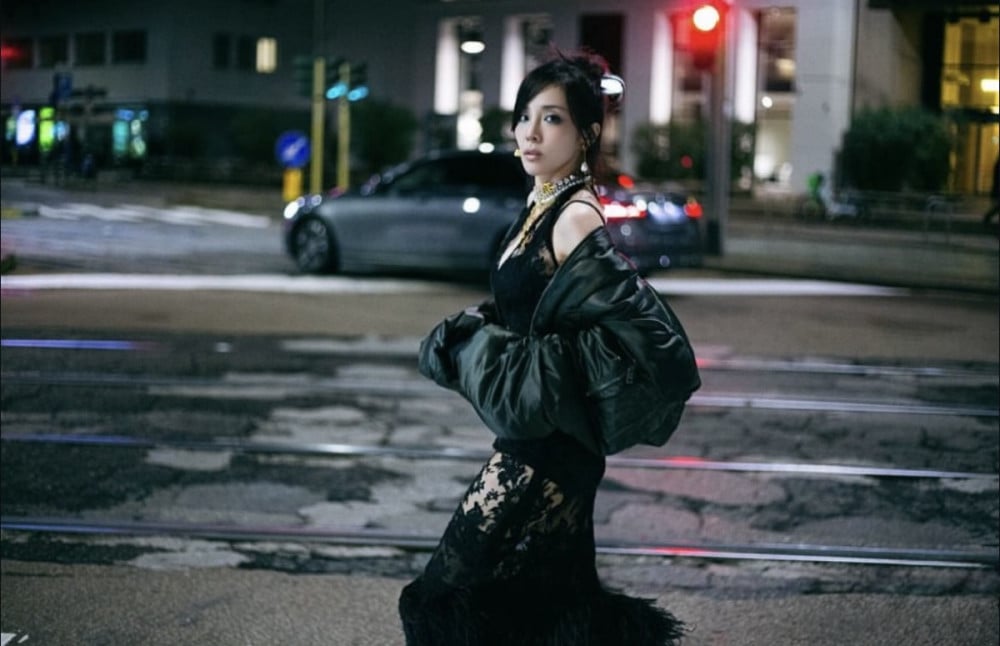 為完成混搭風格,她披上光面 oversized 黑色飛行員外套,配飾包括多層黑珠項鏈與金屬頸鏈,搭配醒目耳環強化視覺衝擊。豹紋手袋成為亮眼焦點,與煙燻眼妝相呼應,營造迷人魅力。