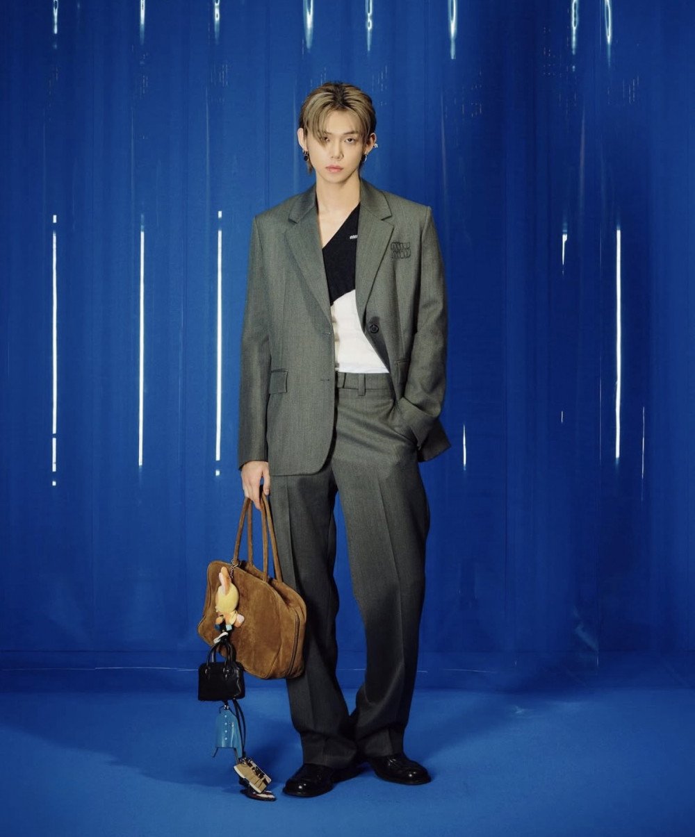 然竣身著馬海毛西裝外套與直筒長褲展現從容奢華,搭配Miu Miu標誌性麂皮蝴蝶結手袋,更添俐落現代感。