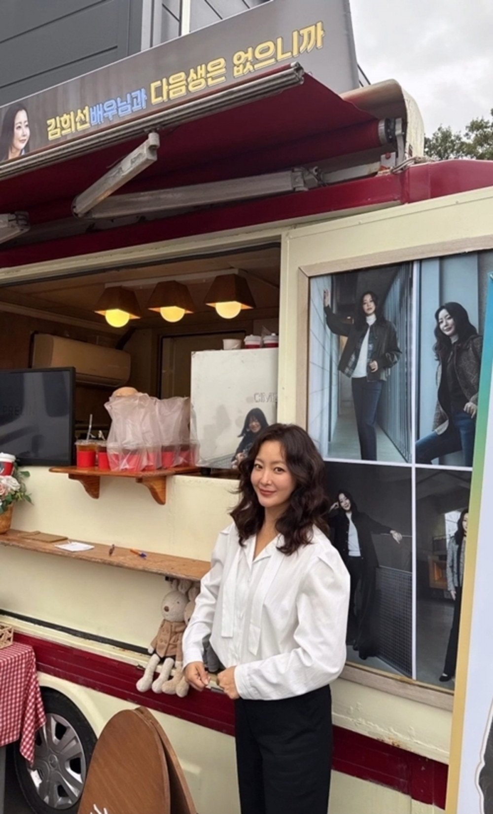 隨文附上的照片中,金憓宣站在應援咖啡車前展露笑顏,車身橫幅印著:「為《沒有來生》劇組全體人員及金憓宣演員應援」