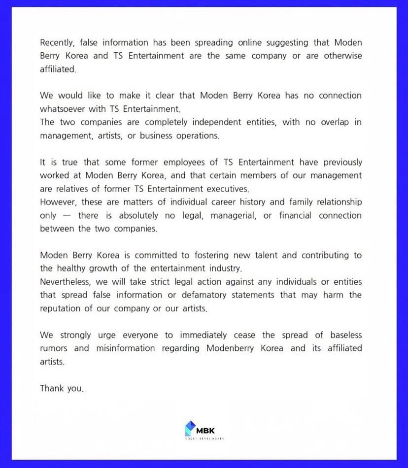 Moden Berry Korea 發表聲明否認與 TS Entertainment 的關聯,並威脅對散佈不實資訊者採取法律行動。