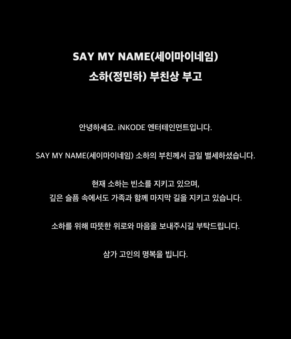 韓國時間10月10日,iNKODE發表官方聲明,公布SAY MY NAME成員Soha父親不幸離世的消息。
